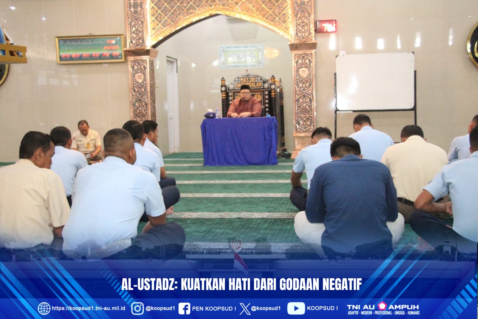 Jakarta, Penkoopsud I. Kegiatan Ibadah yang dilaksanakan bagi umat Islam Makoopsud I yang diisi dengan kajian tafsir Al-Quran khususnya tentang kandungan Surat An-Nas, dalam rangka meningkatkan keimanan dan ketaqwaan bagi para personel Makoops Udara I, yang disampaikan oleh Ustadz Suherman, M.A., M.Pd., C.DAI. bertempat di Mesjid Darussalam Makoops Udara I, Kamis (24/7/25).