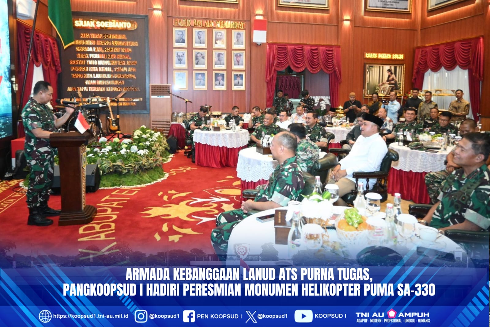 Bogor, Penkoopsud I. Panglima Komando Operasi Udara I Marsda TNI Muzafar, S.Sos., M.M., hadiri peresmian monumen Helikopter Puma SA-330 oleh Panglima TNI Jenderal TNI Agus Subiyanto, S.E., M.Si., yang didampingi Kasau Marsekal TNI M. Tonny Harjono, S.E., M.M., Bupati Bogor Rudy Rusmanto, S.Si., Irjen TNI Letjen TNI M. Saleh Mustafa, Pangkoopsudnas Marsdya TNI Minggit Tribowo, S.I.P., serta Danlanud ATS Marsma TNI A.F. Picaulima, S.Sos., bertempat di Ruang Soekarno Hatta, Pendopo Bupati Bogor, Cibinong, Kabupaten Bogor. (Jumat, 25-7-2025).