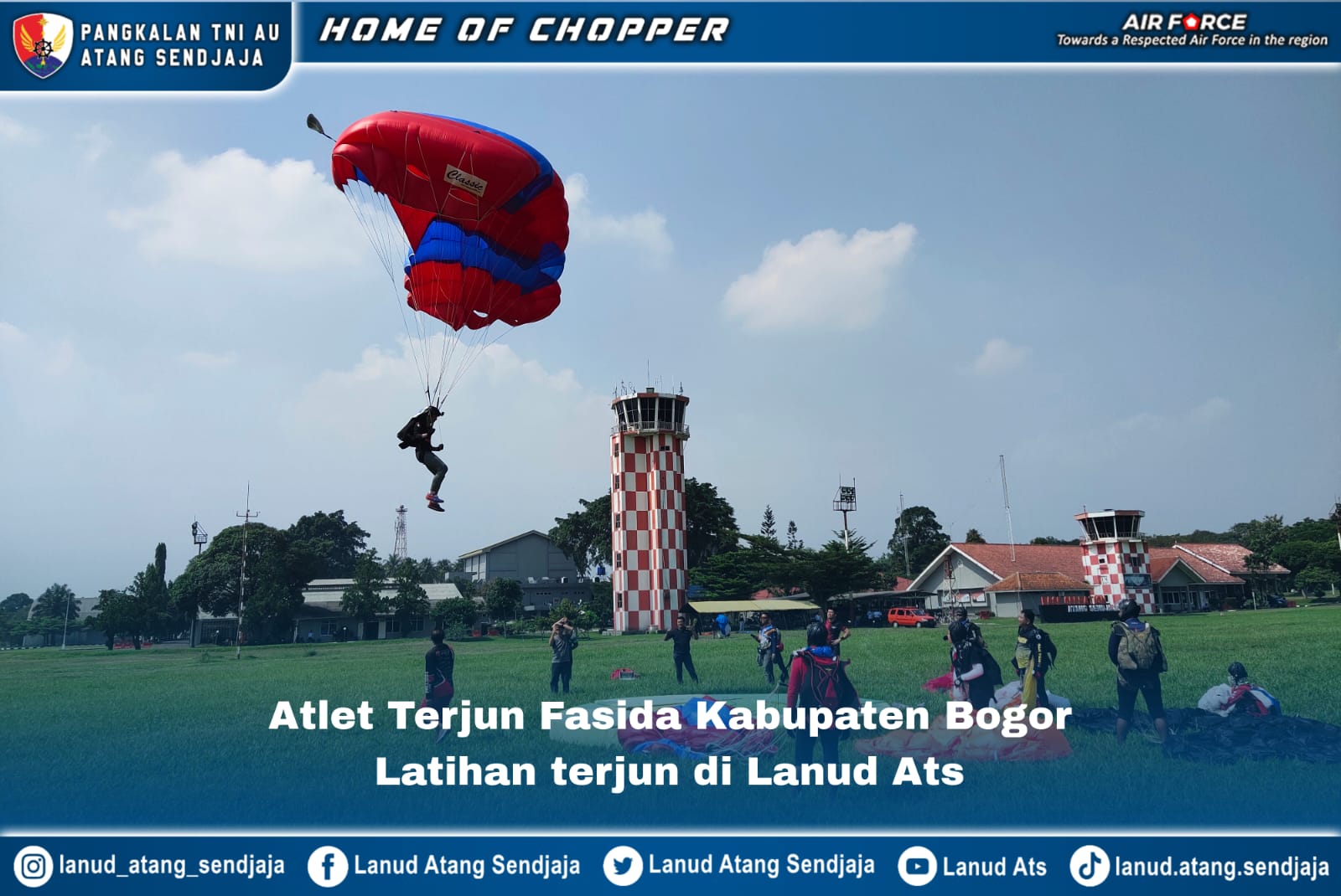 Lanud Atang Sendjaja (Ats). Sebanyak 15 penerjun yang tergabung dalam Federasi Aero Sport Indonesia Daerah (Fasida) Kabupaten Bogor dengan menggunakan pesawat Helikopter Super Puma Skadron Udara 6 Wing 4 Lanud Atang Sendjaja melaksanakan terjun Refreshing di Lanud Atang Sendjaja Bogor, Rabu (12/7/2023).