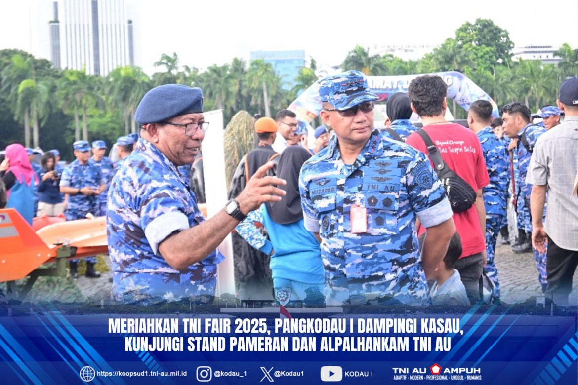 Jakarta. Penkodau I. Komando Daerah TNI Angkatan Udara I (Kodau I) ikut memeriahkan Dirgangara Air Fair 2025 dengan menyuguhkan alutsista, ketahanan pangan dan lain sebagainya, Panglima Kodau I Marsda TNI Muzafar, S.Sos., M.M., turut menghadiri Pameran Dirgantara Fair 2025 yang dibuka oleh Kepala Staf Angkatan Udara Marsekal TNI M.Tony Harjono, S.E., M.M., di lapangan Aldiron, Pancoran Jakarta Selatan, Sabtu (27/9/25).