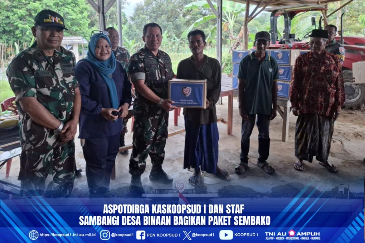 Belitung. Penkoopsud I. Dalam rangka Bakti dan Komunikasi Sosial (Bakkomsos) Aspotdirga Kas Koopsud I dan Staf sambangi warga Desa Binaan Lanud H.AS Hanandjoedin bagikan pake sembako, Belitung , Selasa (24/6/25).