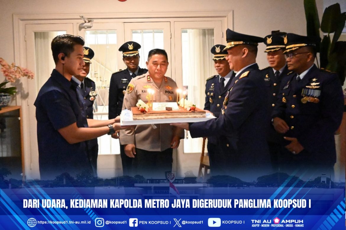 Saat Kapolda Metro Jaya keluar rumah, Panglima Koopsud I Marsda TNI Muzafar, S.Sos., M.M., langsung menyerahkan kue ulang tahun mengatakan, ini sebagai ungkapan rasa syukur dan ucapan selamat Ulang Tahun ke-79 Bhayangkara yang mengusung tema *Polri Untuk Masyarakat*, tentunya mementum penting dan spesial ini dapat mempererat kolaborasi lintas instansi dalam menjaga kedaulatan dan keamanan bangsa.