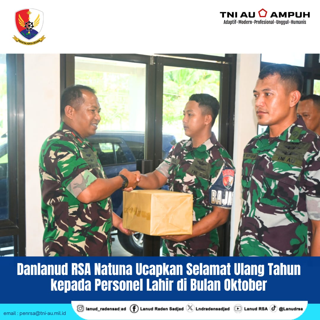 Komandan Lanud Raden Sadjad (RSA) Natuna, Marsekal Pertama TNI Onesmus Gede Rai Aryadi, S.E., M.M., M.Han., memberikan ucapan selamat ulang tahun kepada personel lahir pada priode bulan September sampai dengan Oktober, Selasa (14/10/2025).