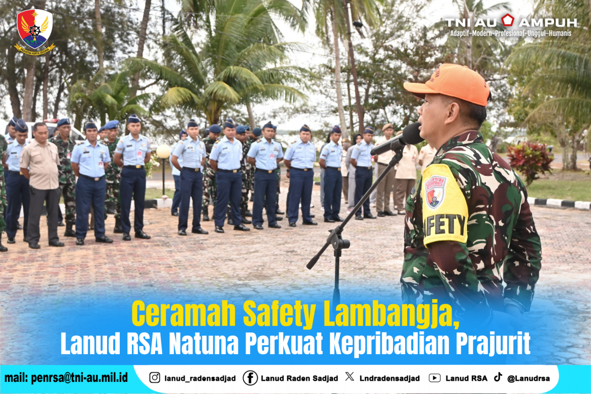 Lanud Raden Sadjad Natuna menggelar ceramah Safety Lambangja di halaman Masjid Mina, Kabupaten Natuna, Provinsi Kepulauan Riau, Rabu (11/2/2026). Kegiatan ini dilaksanakan setelah apel pagi dan disampaikan Ps. Kasi Base Ops Lanud RSA, Kapten Lek Basori.