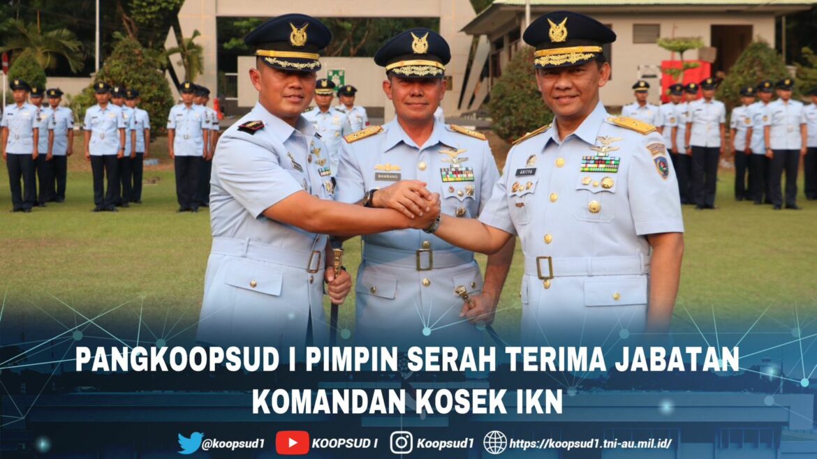 Penyerahan jabatan Komandan Kosek IKN dari Marsma TNI Yuniarsa Aditya Permana, S.E., M.M., kepada Kolonel Pnb Abdul Haris, M.M.Pol., M.M.O.A.S., ditandai penyematan tanda jabatan dan penyerahan tongkat Komando oleh Pangkoopsud I selaku Inspektur Upacara kepada pejabat baru Komandan Kosek IKN.