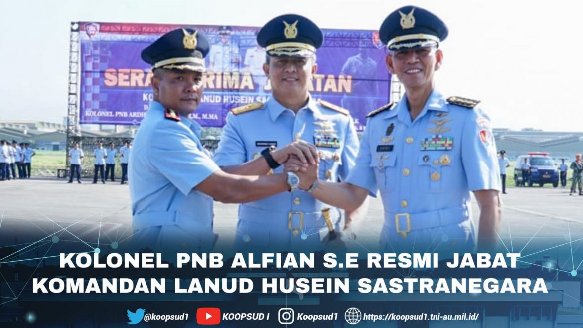 Penkoopsud I. Jabatan Komandan Lanud Husein Sastranegara diserah terimakan dari Kolonel Pnb Ardi Syahri, S.T., M.M., M.A., kepada penggantinya Kolonel Pnb Alfian, S.E., dilaksanakan dalam upacara Sertijab yang dipimpin langsung oleh Panglima Koops Udara I Marsekal Muda TNI Mohammad Nurdin berlangsung di Apron Baseops Lanud Husein Sastranegara, Bandung. Jumat (3 Mei 2024)