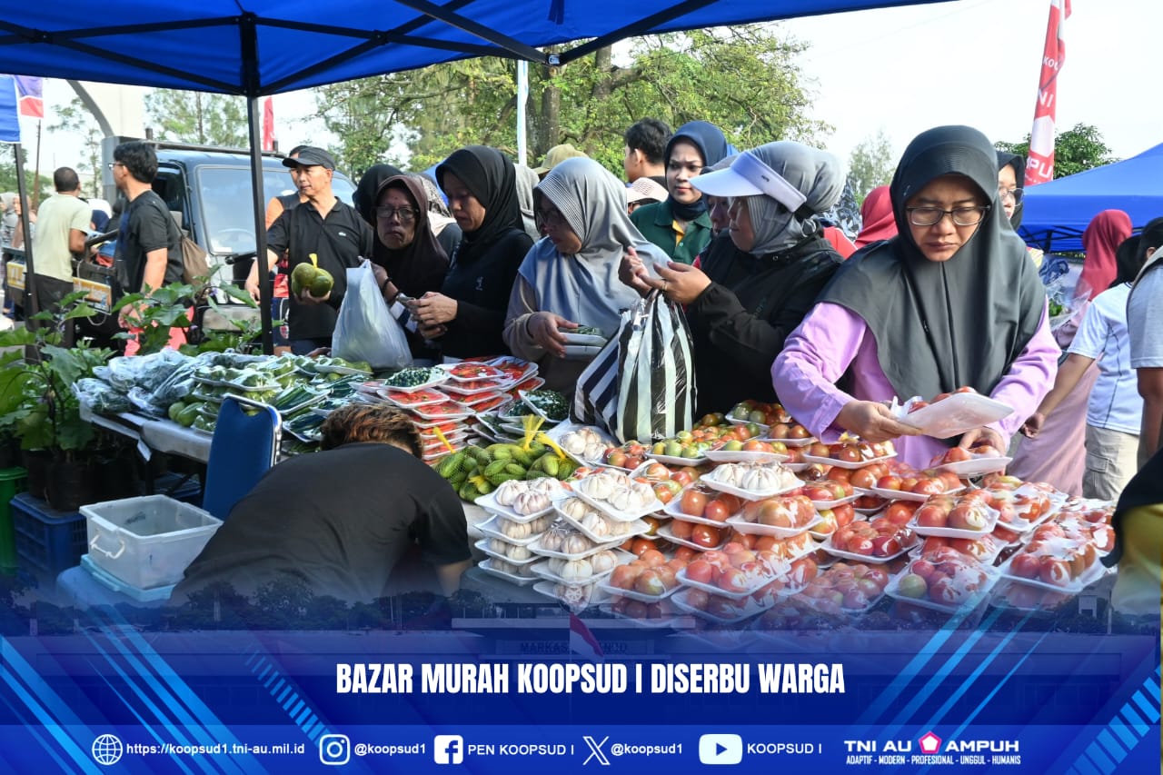 Jakarta. Penkoopsud I. Bazar murah dalam rangka Hari Bakti TNI Angkatan Udara ke-78 yang digelar oleh Panglima Koopsud I diserbu warga bertempat di Ayodya I depan pintu gerbang Makoopsud I Halim Perdana Kusuma Jakarta, Minggu (20/7/25)