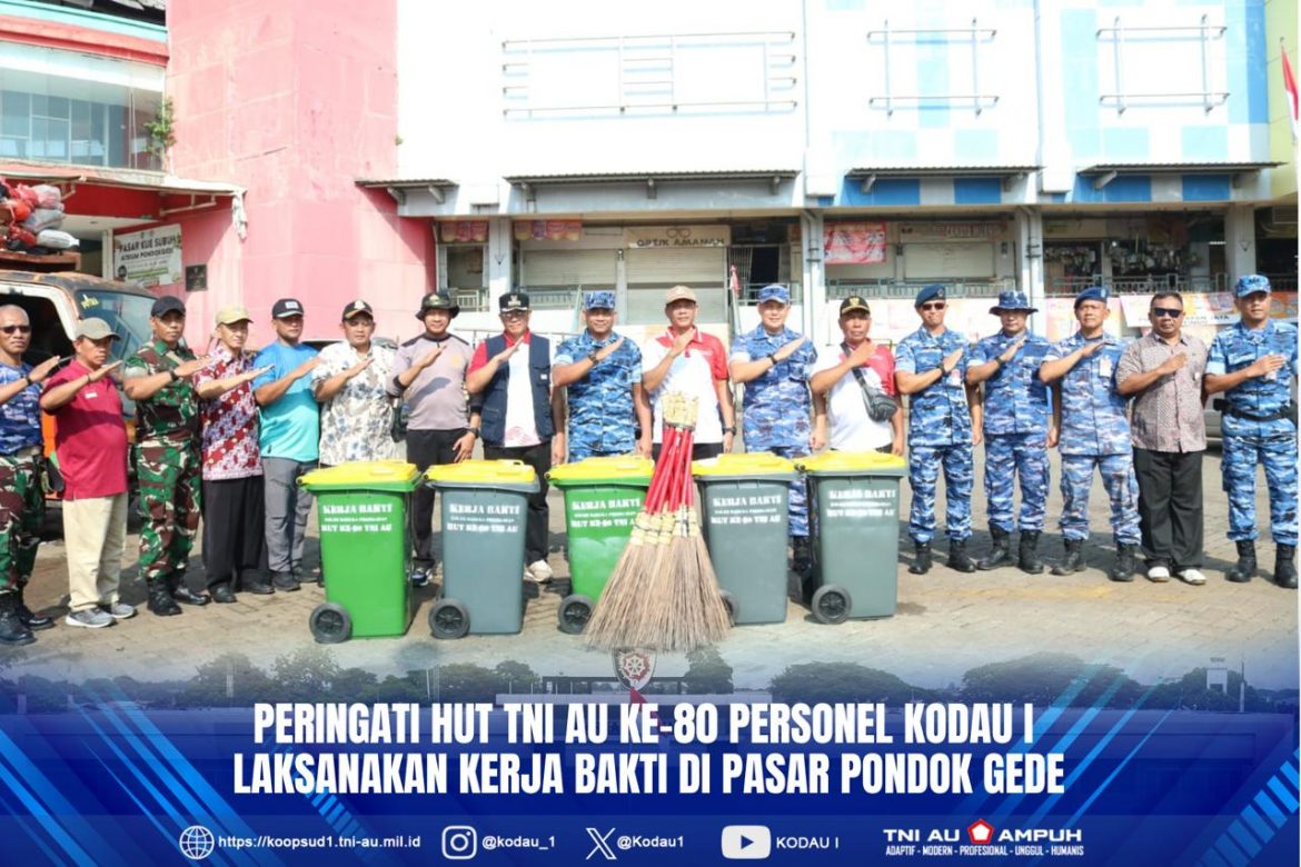 Jakarta, Penkodau I. Menjelang peringatan Hari Ulang Tahun (HUT) ke-80 TNI Angkatan Udara yang jatuh pada 9 April 2026, personel Kodau I yang dipimpin oleh Sahli Bidang Senamu Kodau I Kolonel Tek Istanto, M.Han., melaksanakan kegiatan kerja bakti di sekitar Pasar Pondok Gede, Kota Bekasi, Jawa Barat, sebagai wujud kepedulian serta kemanunggalan dengan masyarakat. (Kamis, 2-4-2026).