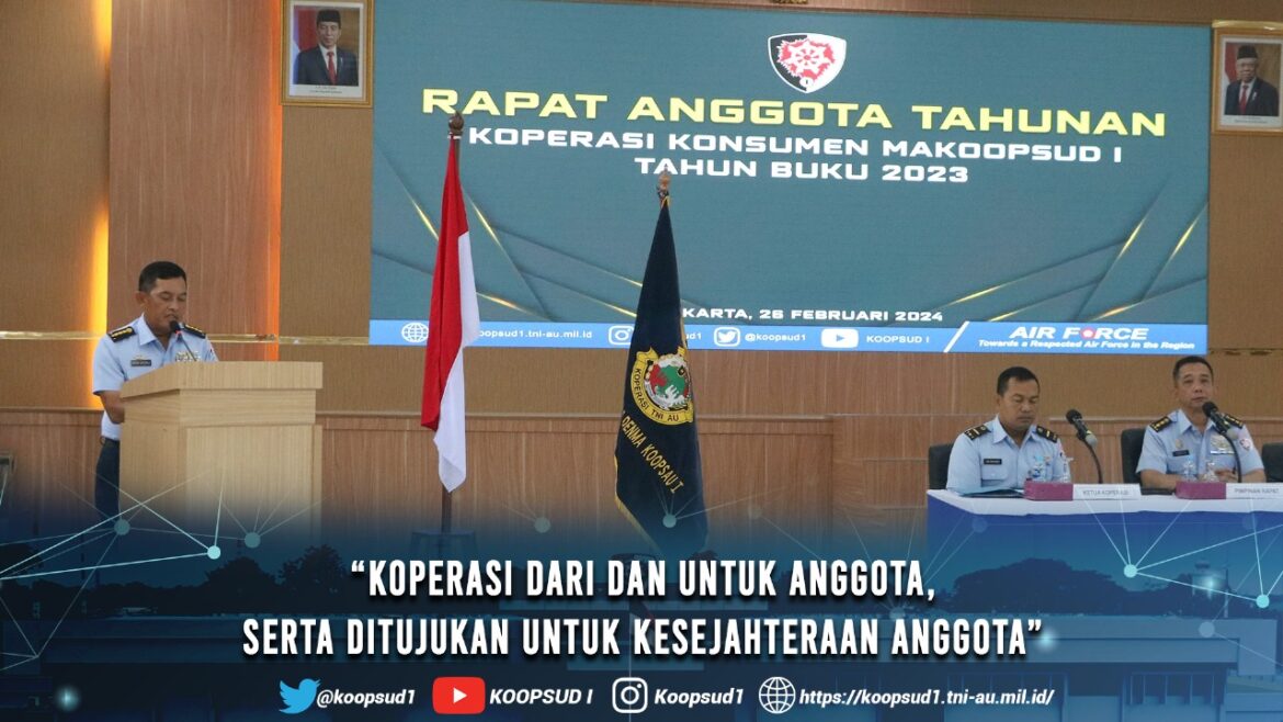 Jakarta, Penkoopsud I. “Jadikan kehadiran koperasi “ada dan berguna” bukan sekedar ada tapi tiada guna. Karena pada dasarnya, koperasi dari dan untuk anggota, serta ditujukan untuk kesejahteraan anggota dalam hal ini khususnya untuk meningkatkan kesejahteraan seluruh anggota Koops Udara I” demikian dijelaskan oleh Pangkoops Udara I Marsda TNI Mohammad Nurdin dalam amanat tertulisnya pada kegiatan Rapat Anggota Tahunan Koperasi Konsumen Makoops Udara I Tahun Buku 2023, yang dibacakan oleh Aslog Kaskoopsud I, Kolonel Tek Iman Gozali, S.E. Dihadiri oleh Para Pejabat Utama beserta seluruh personel Makoops Udara I. Bertempat di Gedung Roesmin Nurjadin Makoops Udara I. (Senin, 26-2-2024).