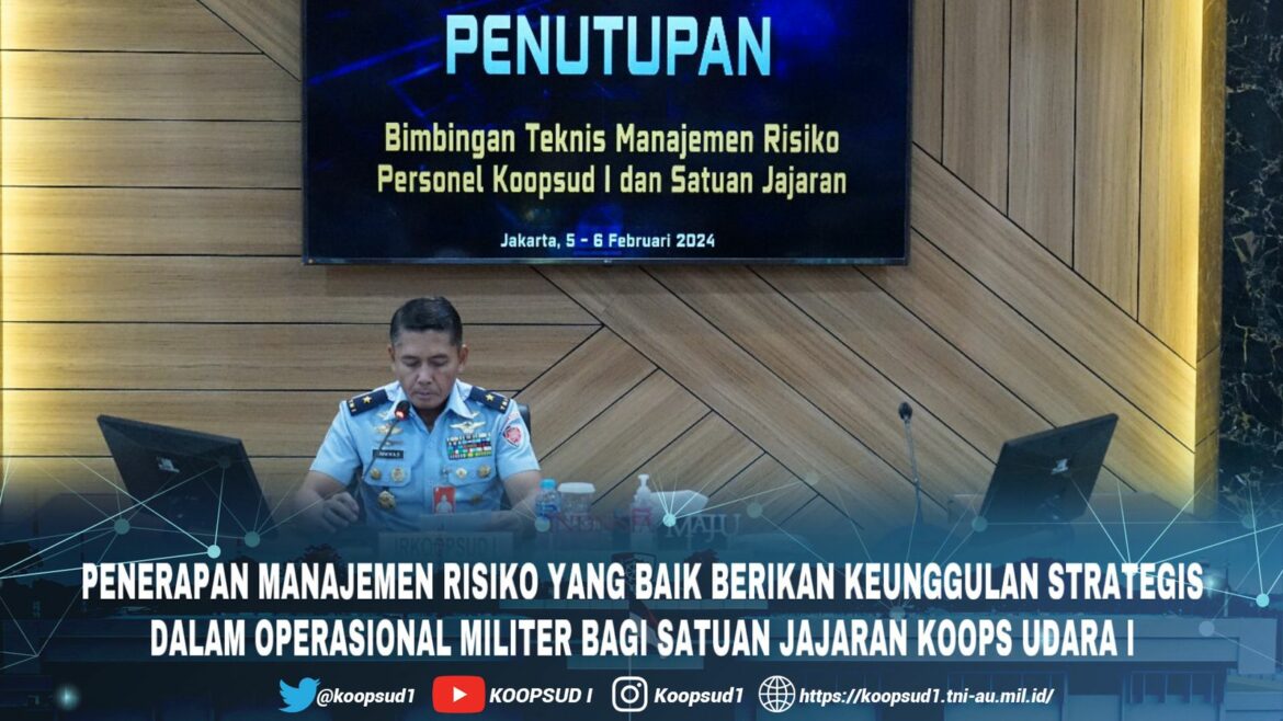 Jakarta, Penkoopsud I. “Manajemen risiko adalah aspek kritis dalam operasional militer, dan pemahaman dan penerapan manajemen risiko yang baik akan memberikan keunggulan strategis bagi satuan jajaran Koops Udara I. Mari bersama-sama terapkan prinsip-prinsip Manajemen Risiko untuk menjaga keberlanjutan dan keberhasilan satuan Koops Udara I dan jajaran”, demikian yang ditegaskan oleh Pangkoops Udara I Marsda TNI Mohammad Nurdin dalam amanat tertulisnya yang dibacakan oleh Ir Koops Udara I, Marsma TNI Arifiani Nur Dwiyanto, M.Han., dalam Penutupan Bimtek Manajeman Risiko. Bertempat di Ruang Yudha Makoops Udara I. (Selasa, 6-2-2024).