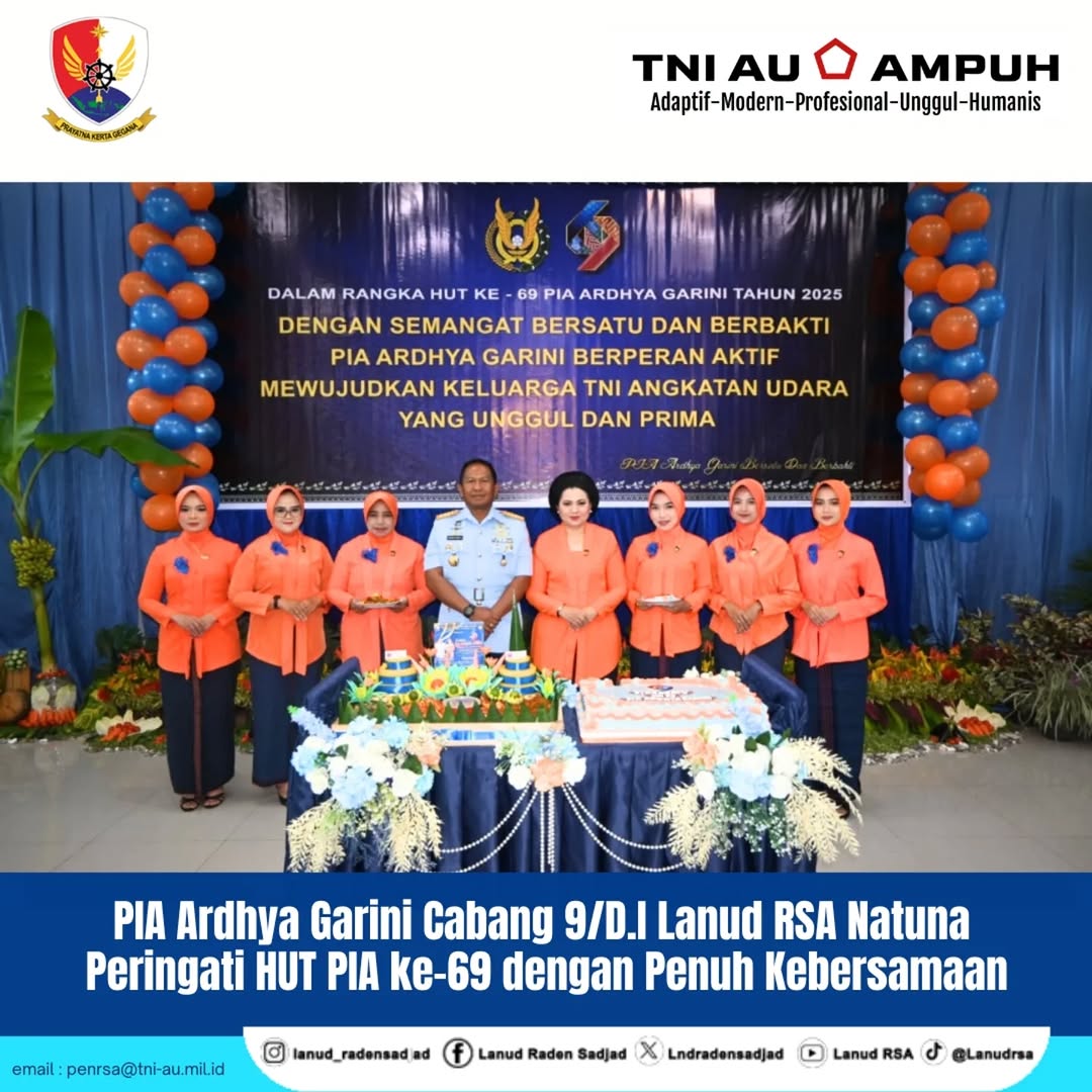 PIA Ardhya Garini (AG) Cabang 9/D.I Kodau I Lanud Raden Sadjad memperingati HUT PIA AG ke-69 di Gedung Graha Serasan Lanud RSA, Kabupaten Natuna, Provinsi Kepri, Kamis (12/11/2025). Acara berlangsung penuh kekeluargaan dan diikuti seluruh jajaran PIA.