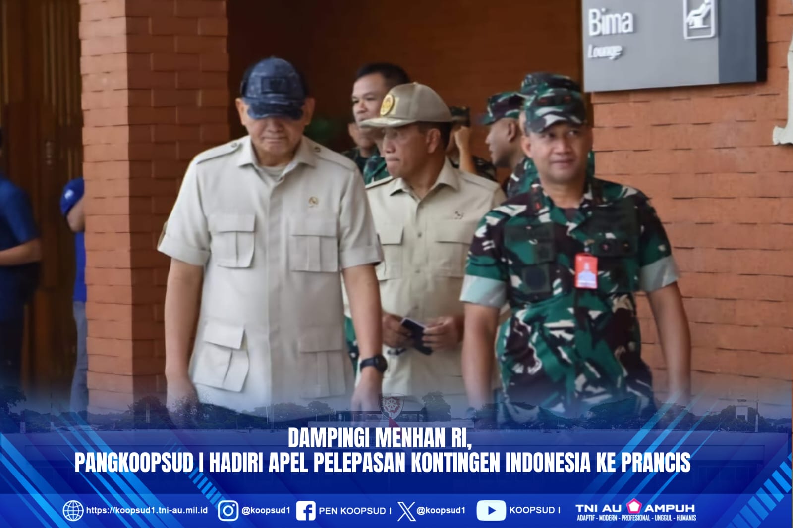 Jakarta, Penkoopsud I. Panglima Komando Operasi Udara I Marsda TNI Muzafar, S.Sos., M.M., dampingi Mentri Pertahanan Republik Indonesia Sjafrie Sjamsoeddin bersama Panglima TNI Jenderal TNI Agus Subiyanto, S.E., M.Si., dan Kapolri Jenderal Polisi Drs. Listyo Sigit Prabowo, M.Si., pada Apel Pelepasan Kontingen Indonesia ke Prancis, bertempat di Baseops Lanud Halim Perdanakusuma. Minggu (6/7/25).