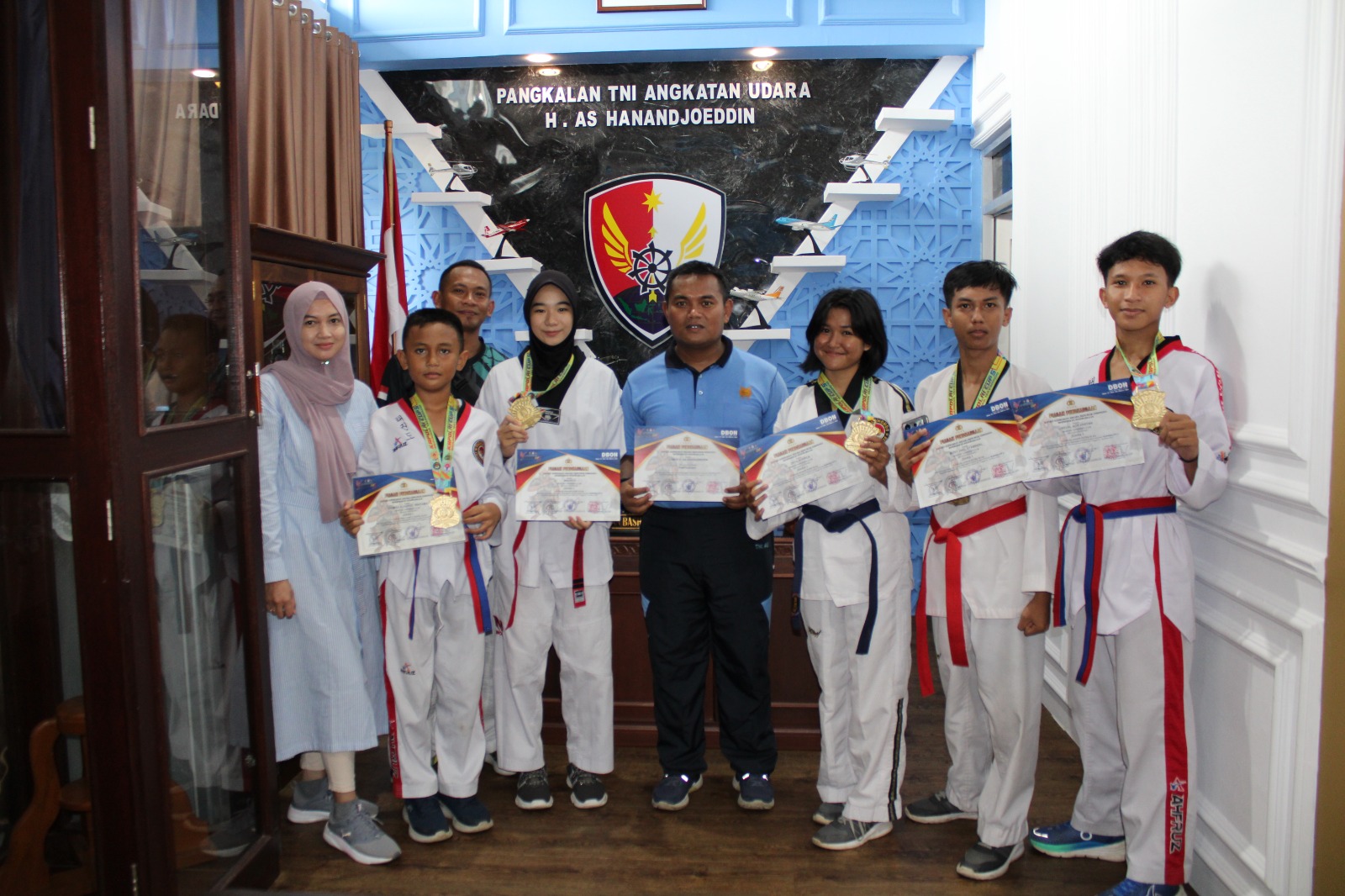 BELTUNG. Komandan Lanud H. AS Hanandjoeddin Letkol Pnb Dian Bashari, S.E.,M.I.Pol. memberikan penghargaan atau Reward kepada Enam atlet Taekwondo binaan Lanud di ruang Kerja Danlanud, (8/3/2024).