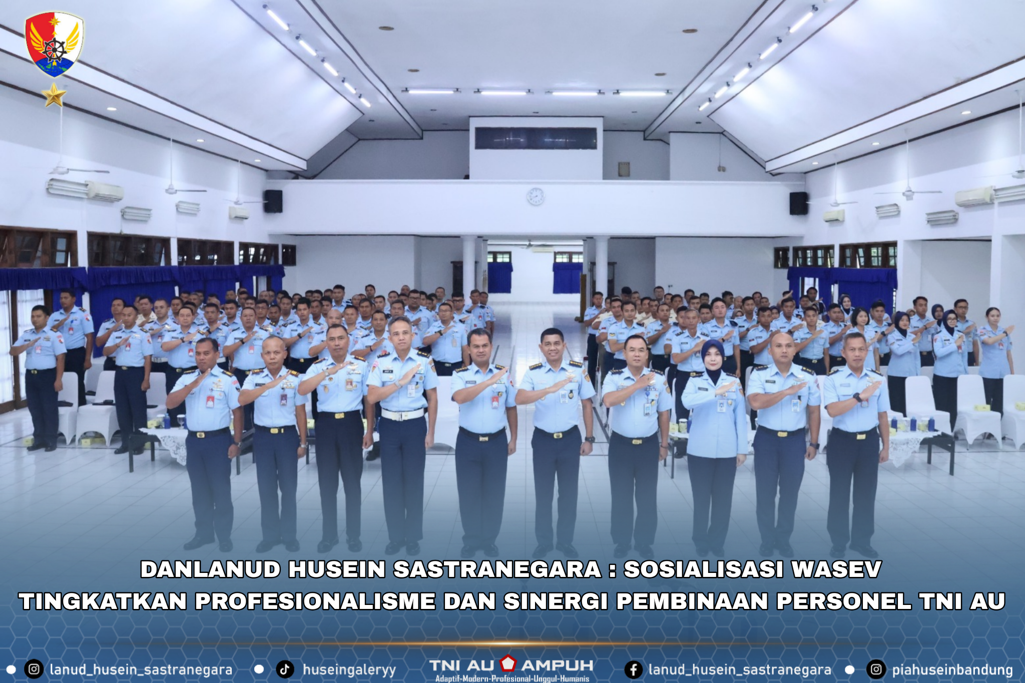 Bandung — Lanud Husein Sastranegara bersama personel Insub TNI AU wilayah Bandung menerima kunjungan Tim Pengawasan dan Evaluasi (Wasev) Spers Mabesau dalam rangka sosialisasi sekaligus evaluasi pelaksanaan Perawatan Personel (Watpers), Pembinaan Mental (Bintal), serta Penegakan Disiplin dan Ketertiban (Gaktib). Kegiatan ini menjadi sarana strategis untuk memperkuat sinergi pembinaan personel di lingkungan TNI Angkatan Udara.