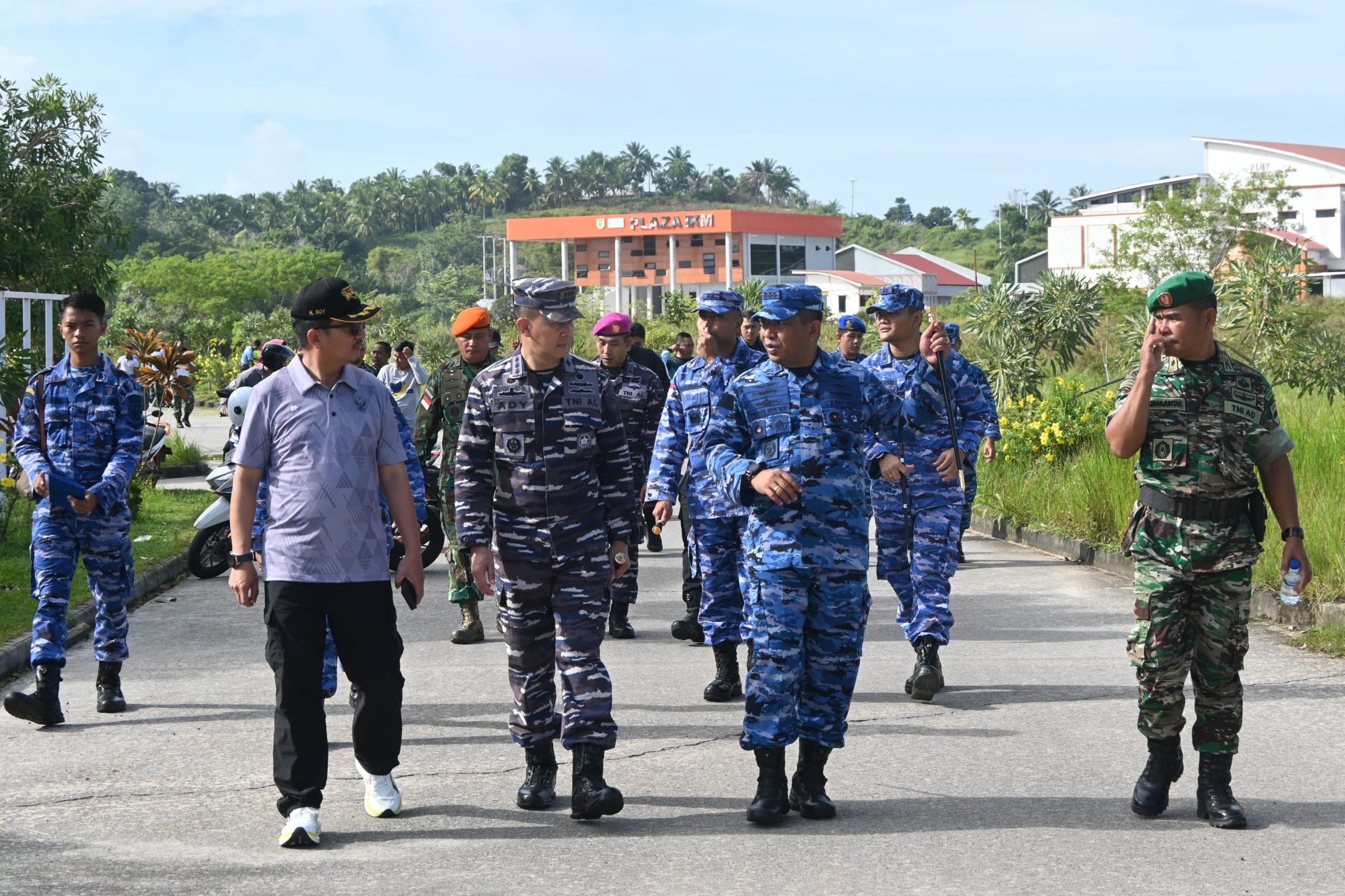 Komandan Lanud Raden Sadjad, Kolonel Pnb Onesmus Gede Rai Aryadi, S.E., M.Han., dan Sekda Natuna Boy Wijanarko Varianto, S.E., bersama Forkopimda serta pimpinan satuan TNI meninjau langsung area pembersihan yang dilakukan secara serentak di sekitar masjid.
