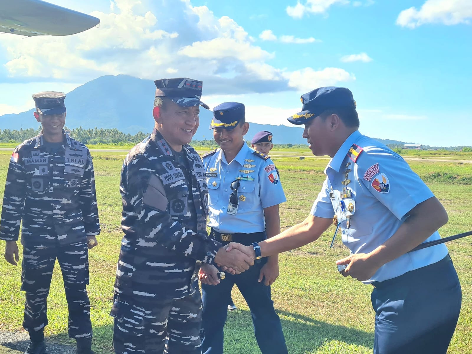 Komandan Lanud Raden Sadjad (RSA) Natuna, Kolonel Pnb Dedy Iskandar, S.Sos., M.M.S., M.Han., menyambut hangat kunjungan kerja Panglima Komando Armada I (Pangkoarmada I) Laksamana Muda TNI Yoos Suryono Hadi., M.Tr (Han)., M.Tr Opsla, di Main Apron Base Ops dan dilanjutkan refresment di VVIP Room Graha Serasan Lanud RSA Natuna, Provinsi Kepulauan Riau, Selasa (23/4/2024).