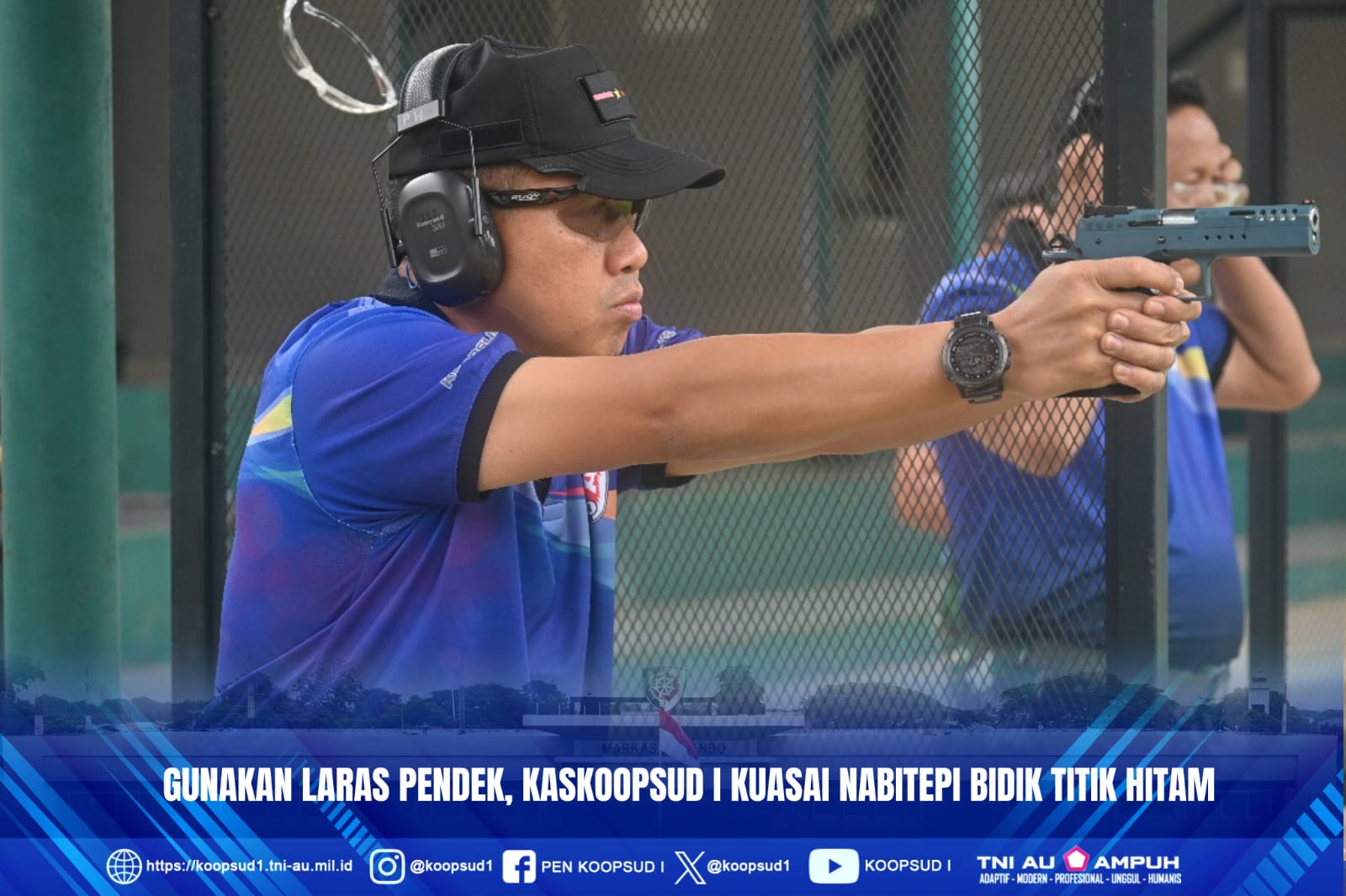 Jakarta, Penkoopsud I. Kepala Staf Koops Udara I (Kaskoopsud I) Marsma TNI Prasetiya Halim, S.H. , kuasai nabitepi gunakan laras pendek, bidik titik tengah hitam uji kemampuan menembak, tempat di lapangan tembak Wing I Kopasgat Halim Perdanakusuma Jakarta Timur, Kamis (19/6/25).