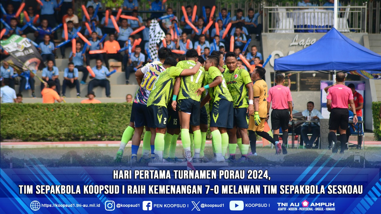 Jakarta, Penkoopsud I. Hari pertama berlangsungnya turnamen Pekan Olahraga TNI Angkatan Udara (Porau) tahun 2024, Tim Sepakbola Koopsud I raih kemenangan 7-0 saat melawan Tim Sepakbola Seskoau. Bertempat di Lapangan Galaxy Makoopsud I. (Senin, 22-7-2024).