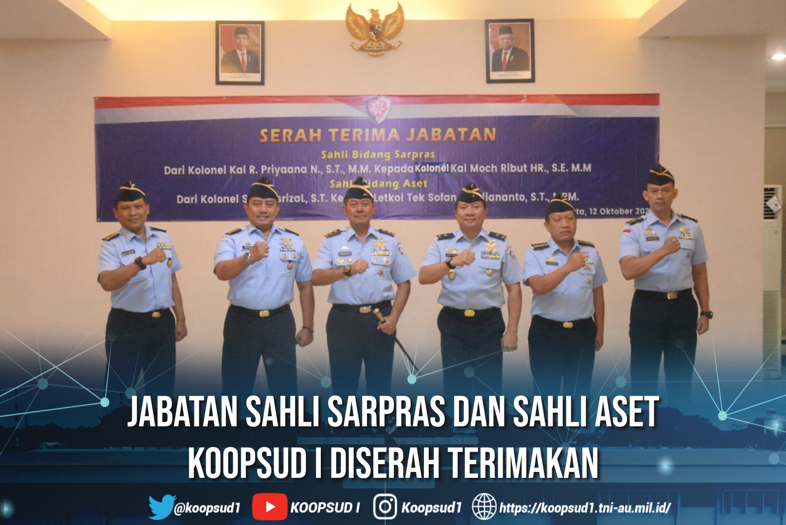 Jakarta Penkoopsud I. Pangkoopsud I Marsekal Muda TNI Bambang Gunarto, S.T., M.M., M.Sc. memimpin acara serah terima jabatan Staf Ahli (Sahli) Bidang Sarpras dan Staf Ahli (Sahli) Bidang Aset Koopsud I, yang berlangsung di Lobi Makoopsud I, Rabu (12/10).