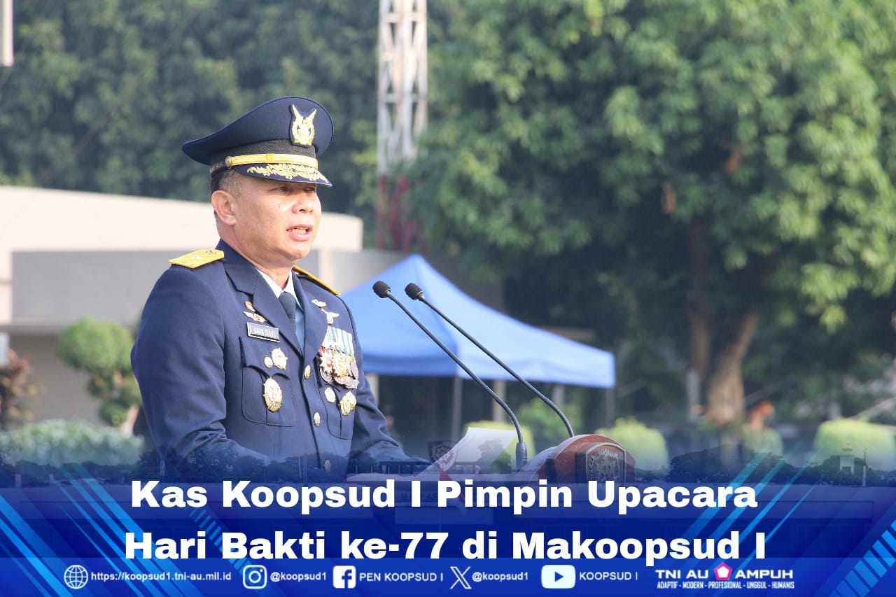 Jakarta, Penkoopsud I. Kepala Staf Koopsud I Marsma TNI Daan Sulfi, S.Sos., M.Si., M.Han., pimpin upacara peringatan Hari Bakti TNI Angkatan Udara ke-77 Tahun 2024. Bertempat di Lapangan Upacara Makoopsud I. (Senin, 29-07-2024). Dalam sambutan Kepala Staf Angkatan Udara (Kasau) Marsekal TNI M. Tonny Harjono, S.E., M.M., terkait Hari Bakti TNI AU ke-77 yang dibacakan oleh Kas Koopsud I Marsma TNI Daan Sulfi, S.Sos., M.Si., M.Han., mewakili Pangkoopsud I Marsda TNI Mohammad Nurdin menyampaikan bahwa, “Sebagai generasi penerus Angkatan Udara, kita harus dapat mengambil pelajaran terpetik atau lesson learned melalui momen Hari Bakti ini, untuk meneladani semangat patriotisme dan rela berkorban para pendahulu, serta memberikan pengabdian kepada TNI Angkatan Udara melalui kegiatan bakti sosial, untuk meringankan beban masyarakat, sebagaimana tekad para pendahulu Angkatan Udara” ujar Kasau. Pada rangkaian peringatan Hari Bakti tahun 2024 ini, TNI AU telah sukses melaksanakan kegiatan karya bakti secara serentak di seluruh tanah air, dan secara terpusat di daerah Kabupaten Maros dan Kabupaten Takalar. Lebih lanjut Kasau menegaskan, “Pertahankan semangat patriotisme para pendahulu Angkatan Udara serta kita harus dapat meringankan beban masyarakat sekitar dalam setiap penugasan, kapan pun dan di mana pun kita berada”. Menutup amanatnya Kasau mengucapkan terima kasih dan menyampaikan penghargaan yang setinggi-tingginya, kepada seluruh prajurit dan Pegawai Negeri Sipil TNI Angkatan Udara, “Atas perjuangan yang telah saudara darma baktikan dengan tulus ikhlas, kepada tanah air yang kita cintai ini”. Upacara tersebut dihadiri oleh Ir Koopsud I, Para Asisten, Para Kepala Satuan Kerja Koopsud I, serta para perwira, bintara, tamtama dan PNS Koopsud I.