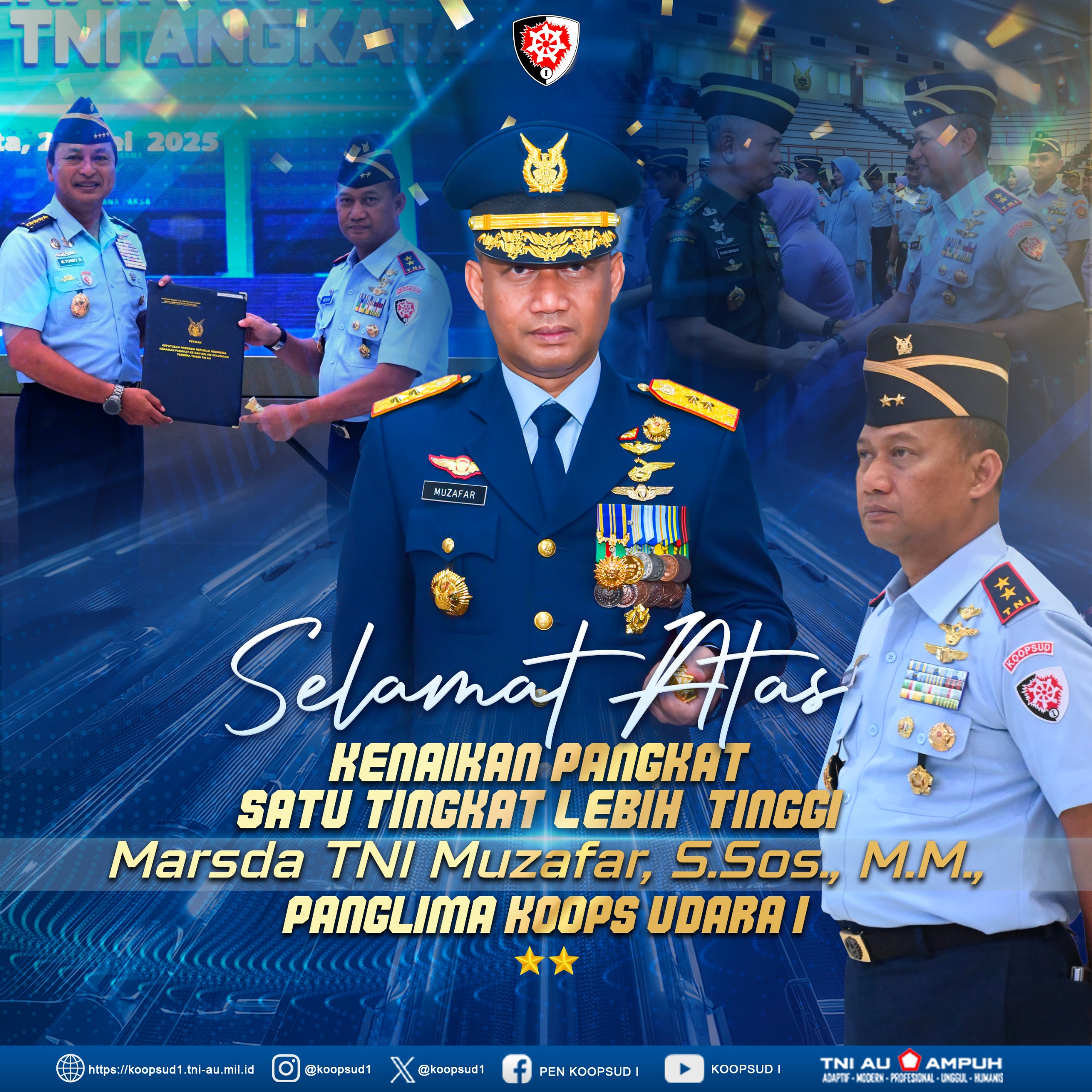 Berita Keluarga Besar Koops Udara I mengucapkan by koopsud berita May 27, 2025 May 27, 2025 0 comment Selamat Atas Kenaikan Pangkat Satu Tingkat Lebih Tinggi Marsda TNI Muzafar, S.Sos., M.M., Panglima Koops Udara I Share 0 Rekomendasi untuk Anda Danlanud Suryadarma – Subang & Danlanud Maimun Saleh – Sabang... February 11, 2022 Pangkoopsud I Tinjau Pelaksanaan Serbuan Vaksinasi di Tangerang, Banten. February 26, 2022 Koopsud I Laksanakan Peringatan Isra Mi’raj 1443 H. March 16, 2022 Pangkoopsud I Silaturahmi ke Kosek IKN March 17, 2022 Koopsud I Gelar Latihan Survival Tempur “Madhi Yudha” di Subang,... March 21, 2022 Latihan Survival Tempur “Madhi Yudha” 2022 Resmi di Tutup March 23, 2022 Pangkoopsud I Meninjau Kesiapan Lanud RSA dan Satrad 212 sebagai... March 25, 2022 Koopsud I Laksanakan Penyusunan/Input Data RKA-KL TA. 2023 March 31, 2022 Pangkoopsud I: Kenaikan Pangkat Wujud Penghargaan Pimpinan Pada Para Personel... April 1, 2022 Pangkoopsud I: Bakti Sosial Wujud Sinergitas Pemda, Masyarakat dan TNI... April 5, 2022
