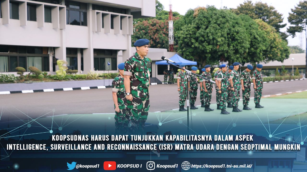 Jakarta, Penkoopsud I. Koopsudnas harus dapat menunjukkan kapabilitasnya dalam Aspek Intelligence, Surveillance and Reconnaissance (ISR) Matra Udara dengan seoptimal mungkin. Tingkatkan terus sinergi komando dan interoperabilitas antar matra dalam seluruh unsur-unsur kekuatan Koopsudnas. Pertajam terus kemampuan tempur satuan-satuan.