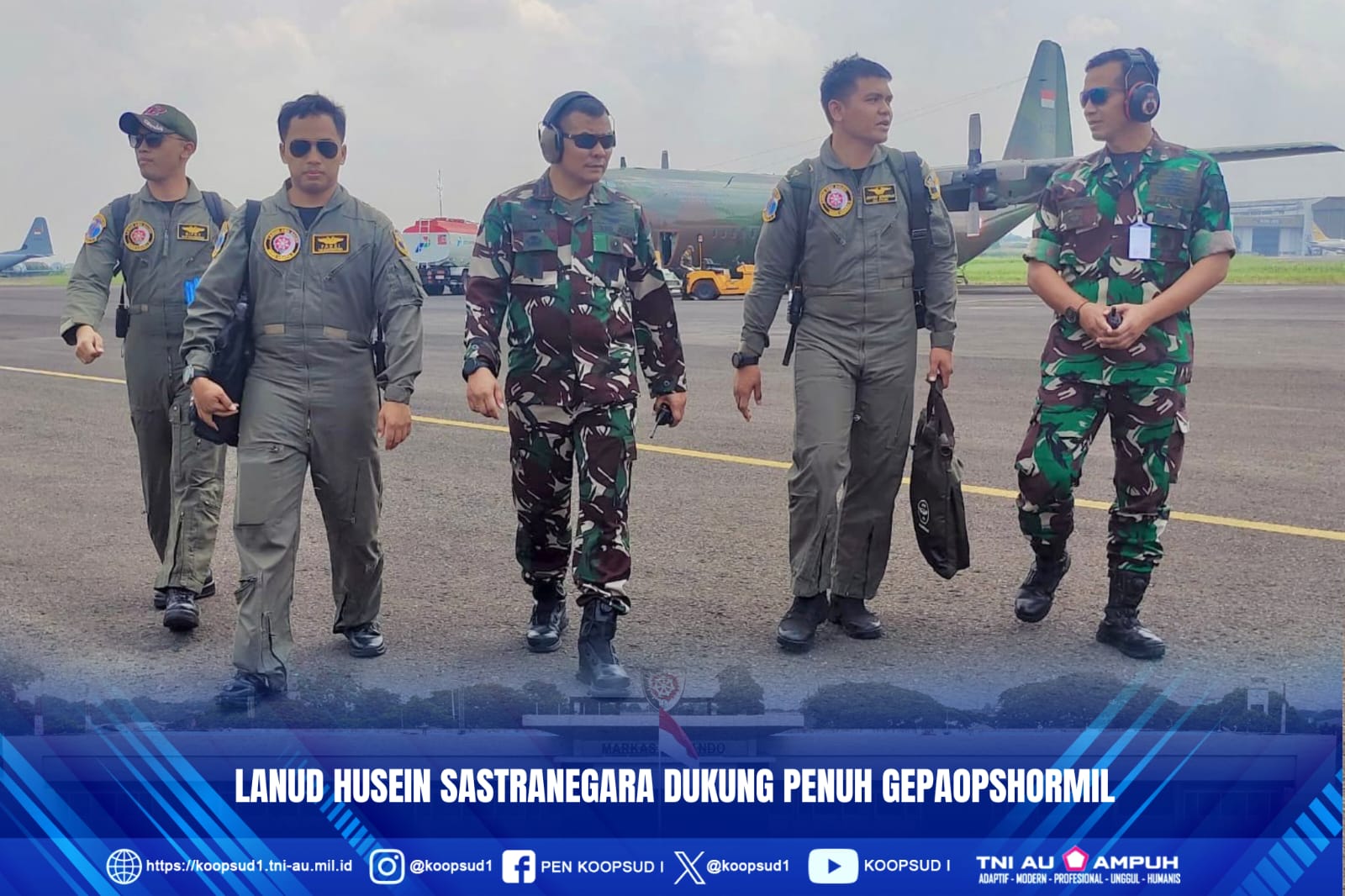 Jakarta-Penkoopsud I. Lanud Husein Sastranegara memberikan dukungan penuh terhadap kegiatan operasi penerbangan Tim Demo Udara TNI AU unsur angkut pada pelaksanaan upacara Gelar Pasukan Operasi Kehormatan Militer (Gepaopshormil) yang akan berlangsung di Pusdikpassus, Batujajar pada tanggal 10 Agustus 2025 mendatang. Minggu (3/8).
