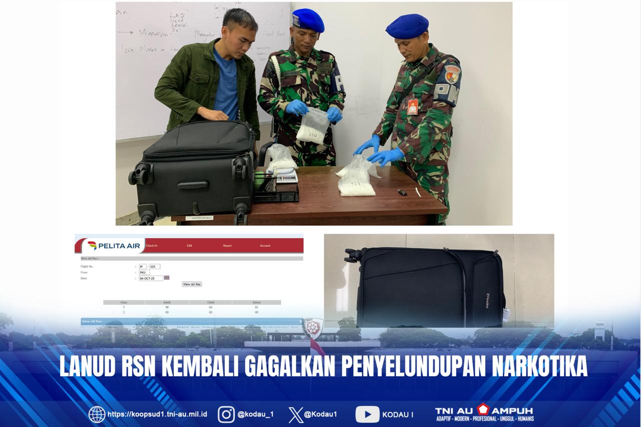 Jakarta, Penkodau I. Satuan jajaran Kodau I Lanud Roesmin Nurjadin kembali menggagalkan penyelundupan Narkotika jenis Sabu didalam koper bagasi penumpang pesawat Pelita/IP-325/Pku-Cgk berjumlah sebanyak 4 bungkus. Bertempat di Hold Baggage Security Check Point (HBSCP) Ruang Rekonsiliasi di Terminal Keberangkatan Domestik Bandara Internasional SSK II Pekanbaru. (Sabtu, 4-10-2025).