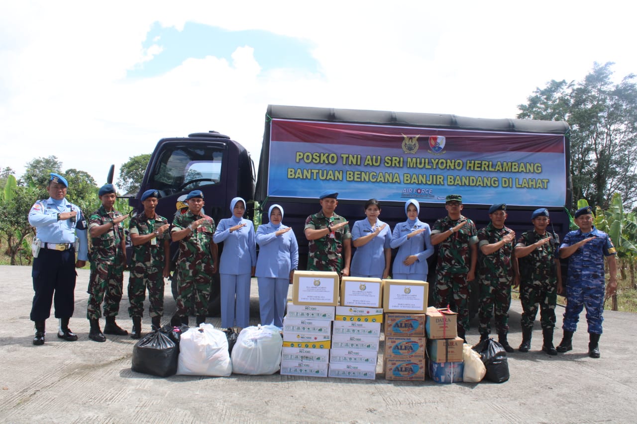 Palembang, Penkoopsud I. Satuan jajaran Koopsud I dari Lanud Sri Mulyono Herlambang (SMH) yang dipimpin oleh Danlanud SMH Kolonel Pnb Sigit Gatot Prasetyo, M.M.O.A.S., dan Ketua PIA AG Cab.10/D.I Lanud SMH Ny. dr. Monika Sigit Gatot Prasetyo, berangkatkan tim siaga bencana alam yang membawa bantuan sosial, berupa sembako yang diperuntukkan bagi masyarakat Kecamatan Kikim Selatan, Kabupaten Lahat, Sumatera Selatan yang terdampak bencana banjir bandang. (Jumat, 10-3-2023).