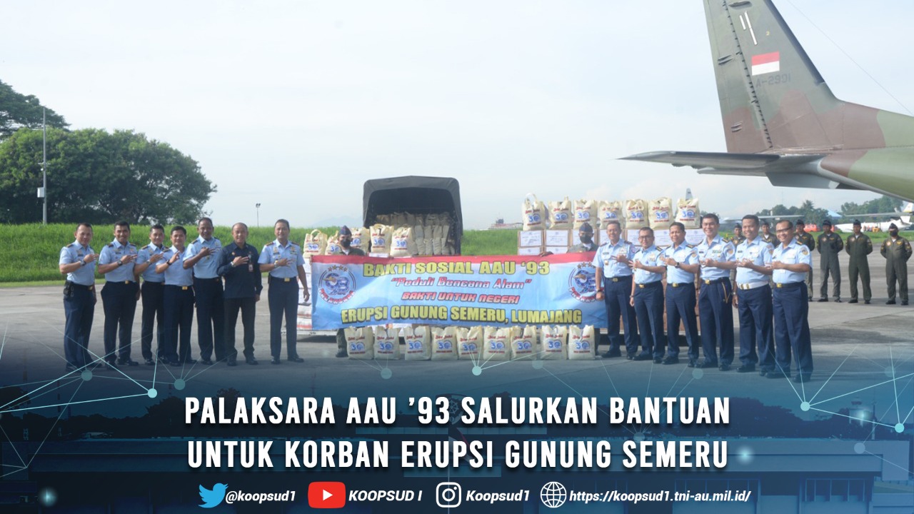 Jakarta, Penkoopsud I. Perwira Alumni Akabri Udara Sayap Tanah Air (Palaksara) AAU ’93 yang diwakili oleh Pangkoopsudnas Marsdya TNI Mohamad Tonny Harjono, S.E., M.M., dengan didampingi Pangkoopsud I Marsda TNI Bambang Gunarto, S.T., M.M., M.Sc. dan Komandan Lanud Halim Pedanakusuma Marsma TNI Adrian P. Damanik, S.T., M.M.,, menyerahkan bantuan sosial secara simbolis untuk korban bencana alam erupsi Gunung Semeru, Lumajang bertempat di Shelter Skadron Udara 2 Lanud Halim Perdanakusuma, Jakarta. Rabu (14/12).
