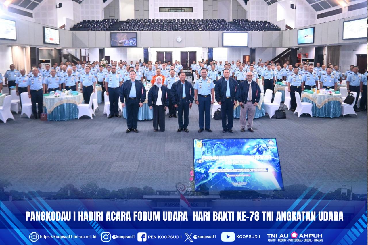 Panglima Komando Daerah TNI Angkatan Udara I, (Pangkodau I) Marsda TNI Muzafar, S.Sos., M.M., turut menghadiri acara forum udara dalam rangkaian hari Bakti Ke-78 TNI Angkatan Udara, kegiatan ini yang dilaksanakan di GSG Suharnoko Harbani, Rabu (20/8/25).