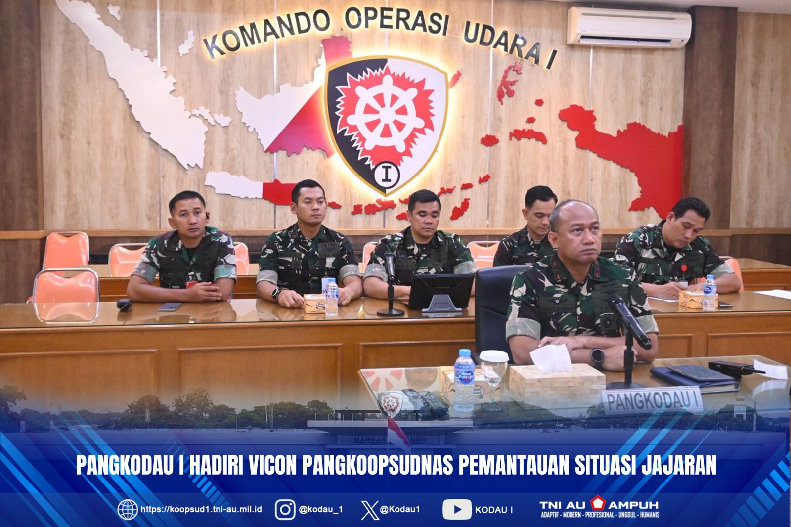 Jakarta, Penkodau I. Pangkodau I Marsda TNI Muzafar, S.Sos., M.M., menghadiri vicon yang dipimpin oleh Pangkoopsudnas Marsdya TNI Minggit Tribowo, S.I.P., bertempat di Rupat Sops, Makodau I. (Minggu, 31-8-2025).