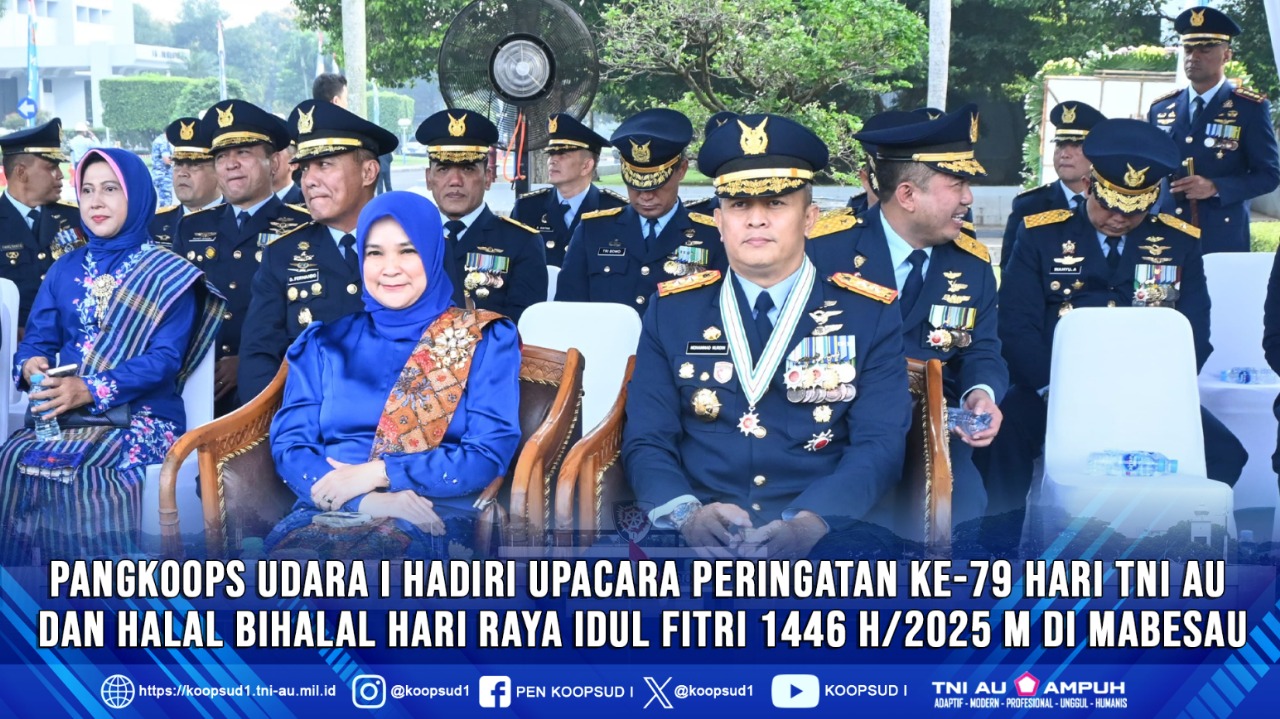 Jakarta, Penkoopsud I. Pangkoops Udara I Marsda TNI Mohammad Nurdin menghadiri upacara peringatan ke-79 Hari TNI Angkatan Udara tahun 2025 beserta Halal Bihalal Hari Raya Idul Fitri 1446 H/2025 M yang dilaksanakan di Mabesau, Cilangkap, Jakarta Timur. (Rabu,9-4-2025).