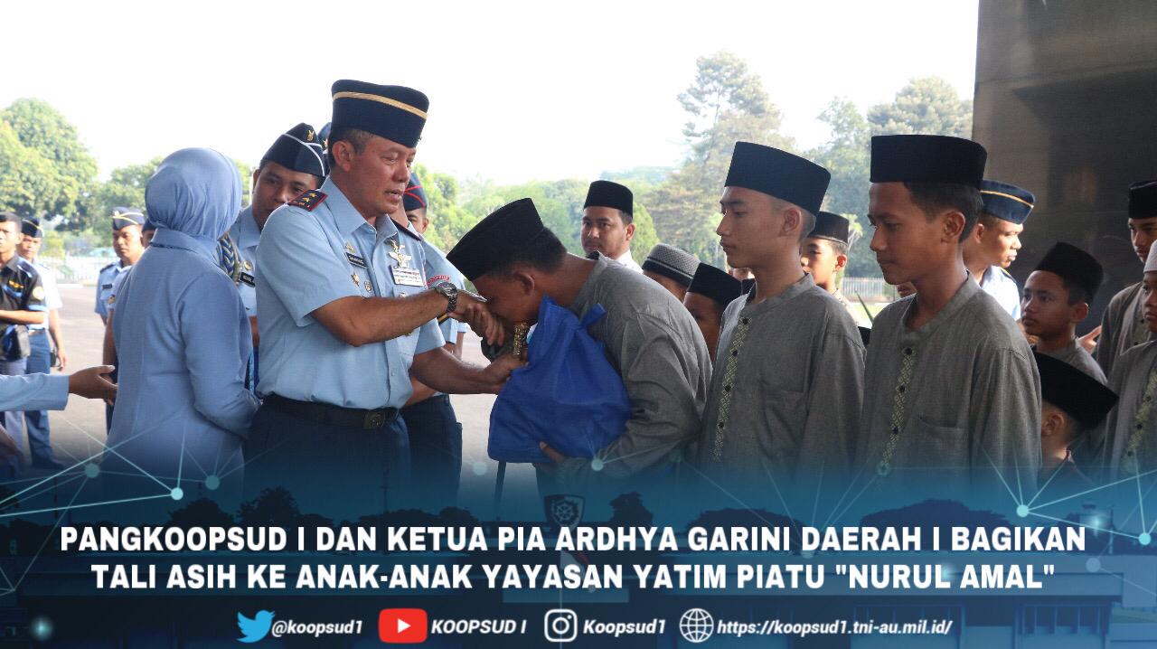 Jakarta, Penkoopsud I. Panglima Komando Operasi Udara I Marsda TNI Bambang Gunarto, S.T., M.M., M.Sc., dan Ketua PIA Ardhya Garini Daerah I Koopsud I Ny. Mala Bambang Gunarto berikan tali asih berupa paket sembako dan santunan kepada anak-anak dari Yayasan Yatim Piatu “Nurul Amal” (berlokasi di daerah Kramat Jati – Jakarta Timur), yang diserahkan kepada Ketua Yayasan Panti Asuhan Nurul Amal, Ustadz Yusron Jaelani, M.Pd. Bertempat di Lobi Depan Makoopsud I. (Rabu, 22-11-2023).