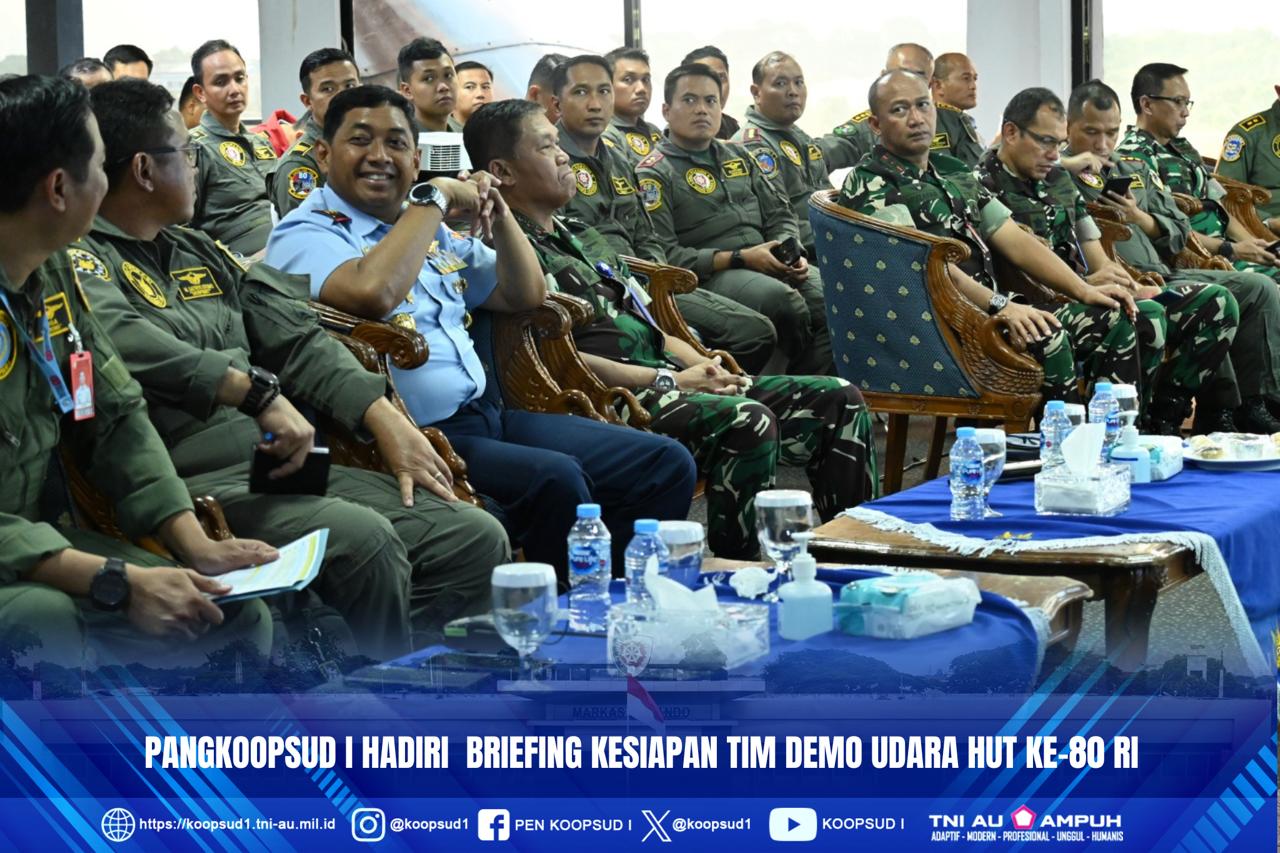 Jakarta, Penkoopsud I. Panglima Komando Operasi Udara I Marsda TNI Muzafar, S.Sos., M.M., hadiri briefing Pangkoopsudnas Marsdya TNI Minggit Tribowo, S.I.P., kepada seluruh air crew yang terlibat dalam Tim Demo Udara HUT ke- 80 RI, bertempat di Terminal Selatan Lanud Halim Perdanakusuma. Rabu (13/8/25).