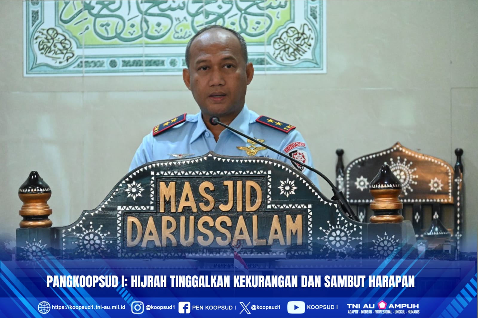 Demikian yang dikatakan Panglima Koops Udara I Marsda TNI Muzafar, S.Sos., M.M., dalam sambutannya pada Peringatan I Muharram 1447 H/2025 M, tempat Masjid Darussalam Makoops Udara I Halim PK, Rabu (2/7/25).