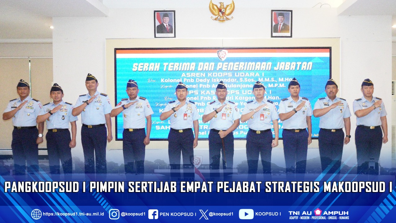 Empat pejabat tersebut diantaranya serah terima jabatan Asren Koopsud I dari Kolonel Pnb Dedy Iskandar, S,Sos., M.M.S., M.Han., kepada Kolonel Pnb Arie Sulanjana, S.T., M.P.M., Asops Kaskoopsud I dari Kolonel Pnb R. Endri Kargono, M.Han., kepada Kolonel Pnb Gusti Made Yoga Ambara, S.E., Kalaiklambangja Koopsud I dari Kolonel Nav Sudaryanto, S.M., kepada Letkol Pnb Immanuel Simarmata, S.E., MMDS., dan Penerimaan Jabatan Staf Ahli Bidang Stratops Koopsud I Kolonel Pas Paulus Purwadi, S.Pd.