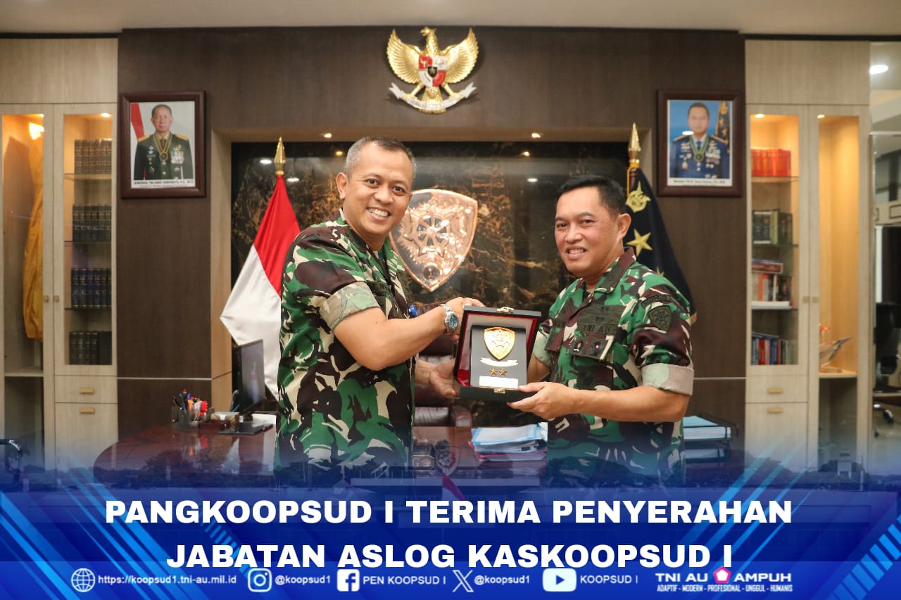 Hadir mendampingi penyerahan jabatan Aslog Kaskoopsud I, Kaskoopsud I Marsma TNI Daan Sulfi, S.Sos., M.Si., M.Han., Danpom Koopsud I Kolonel Pom Roni Widayanto, S.H., dan Aspers Kaskoopsud I Kolonel Pnb Sugeng Sugiharto, S.Sos.