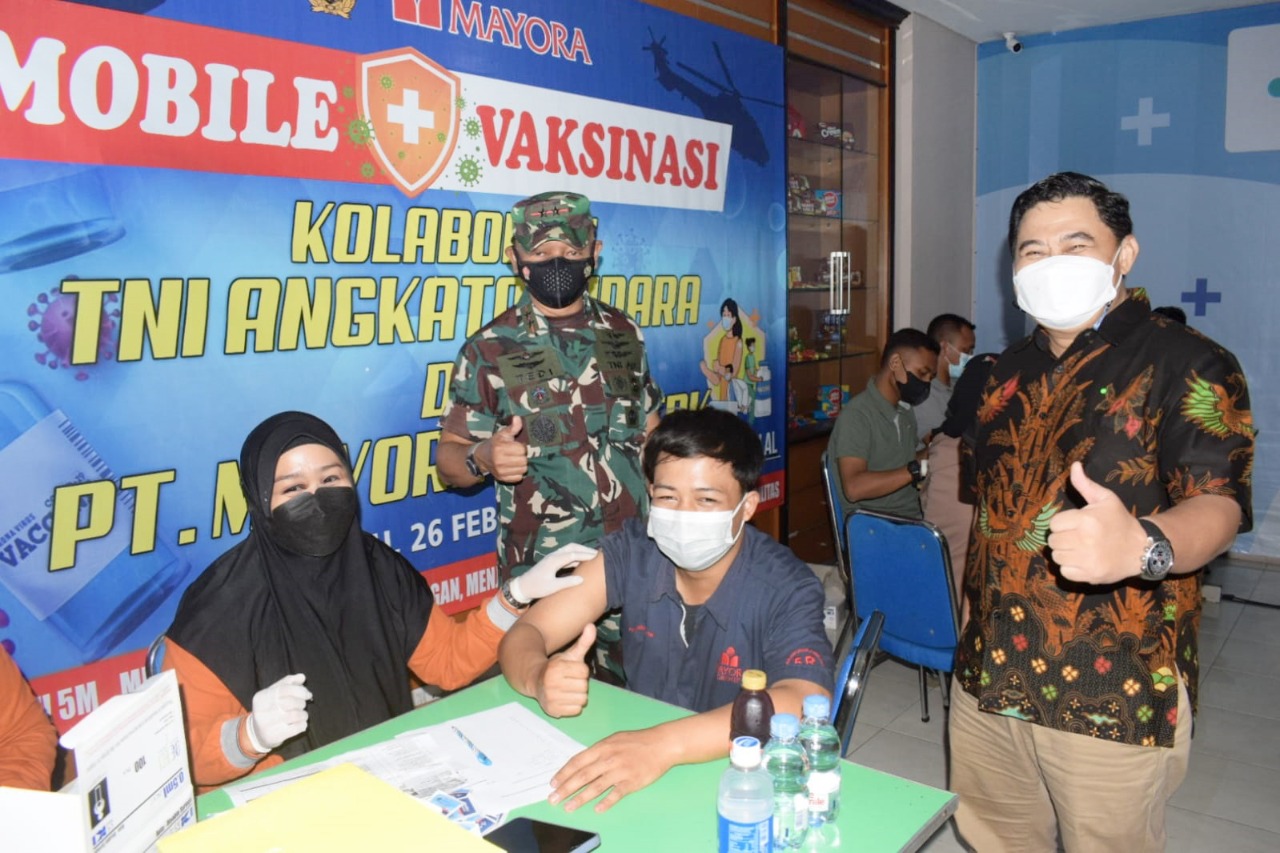 Pangkoopsud I Marsda TNI Ir. Tedi Rizalihadi S, M.M., di dampingi Asops Kaskoopsud I Kolonel Pnb Radar Soeharsono serta para pejabat Lanud Halim Perdanakusuma, langsung melihat serbuan vaksinasi yang dilaksanakan di PT. Mayora tersebut.