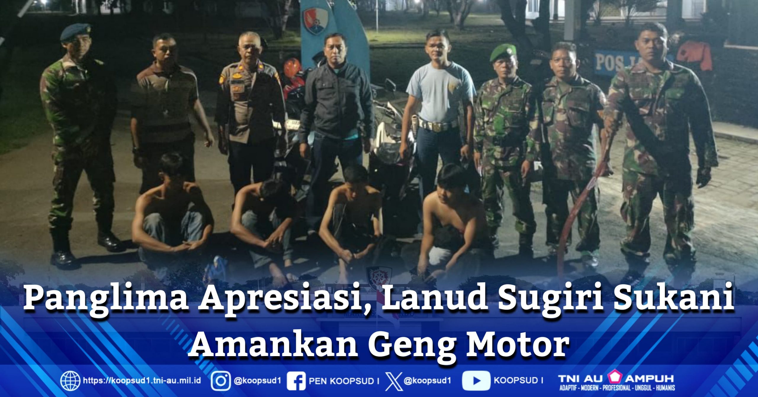 Dalam hal ini Panglima Koops Udara I Marsda TNI Muzafar, S.Sos., M.M., mengatakan saya bangga jajaran Lanud di Koops Udara I khususnya Lanud Sugiri Sukani yang peka dan waspada terhadap lingkungan dari setiap gangguan-gangguan kemananan seperti Geng Motor yang telah meresahkan masyarakat apalagi melakukan tindakan kriminal.