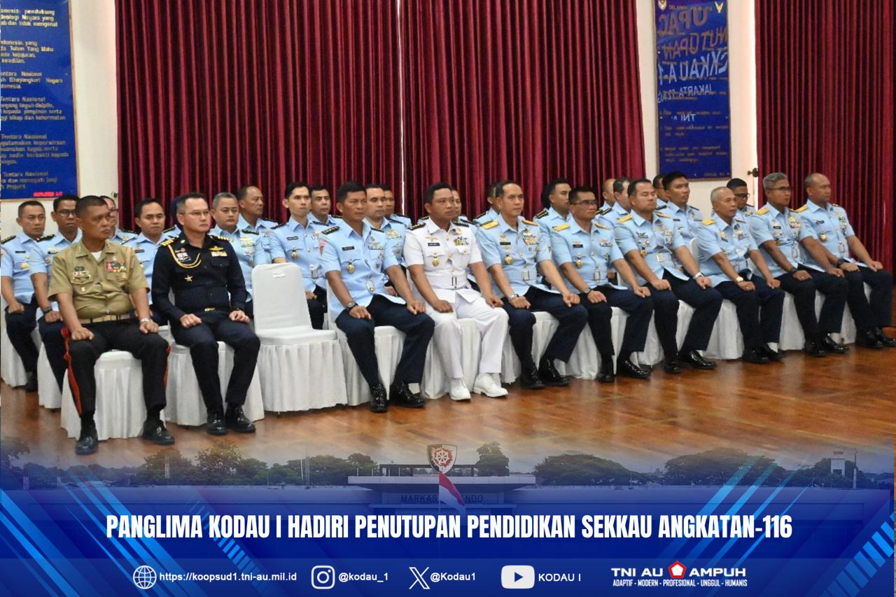 Jakarta, Penkodau I. Panglima Komando Daerah TNI AU I Marsekal Muda TNI Muzafar, S.Sos., M.M. menghadiri penutupan Pendidikan Sekolah Komando Kesatuan TNI Angkatan Udara Angkatan 116 TA. 2025 yang berlangsung di Gedung Pramanasala Sekkau, Jakarta. Jumat (22/8/2025)