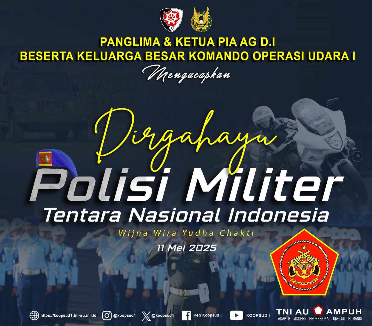 Berita Panglima Komando Operasi Udara I dan Ketua PIA AG Daerah I beserta Keluarga Besar Koopsud I mengucapkan by koopsud berita May 11, 2025 May 11, 2025 0 comment Dirgahayu Polisi Militer Tentara Nasional Indonesia Wijna Wira Yudha Chakti 11 mei 2025 #Koopsud1 #Abhibhutiantarikshe Share 0 Rekomendasi untuk Anda Danlanud Suryadarma – Subang & Danlanud Maimun Saleh – Sabang... February 11, 2022 Pangkoopsud I Tinjau Pelaksanaan Serbuan Vaksinasi di Tangerang, Banten. February 26, 2022 Koopsud I Laksanakan Peringatan Isra Mi’raj 1443 H. March 16, 2022 Pangkoopsud I Silaturahmi ke Kosek IKN March 17, 2022 Koopsud I Gelar Latihan Survival Tempur “Madhi Yudha” di Subang,... March 21, 2022 Latihan Survival Tempur “Madhi Yudha” 2022 Resmi di Tutup March 23, 2022 Pangkoopsud I Meninjau Kesiapan Lanud RSA dan Satrad 212 sebagai... March 25, 2022 Koopsud I Laksanakan Penyusunan/Input Data RKA-KL TA. 2023 March 31, 2022 Pangkoopsud I: Kenaikan Pangkat Wujud Penghargaan Pimpinan Pada Para Personel... April 1, 2022 Pangkoopsud I: Bakti Sosial Wujud Sinergitas Pemda, Masyarakat dan TNI... April 5, 2022