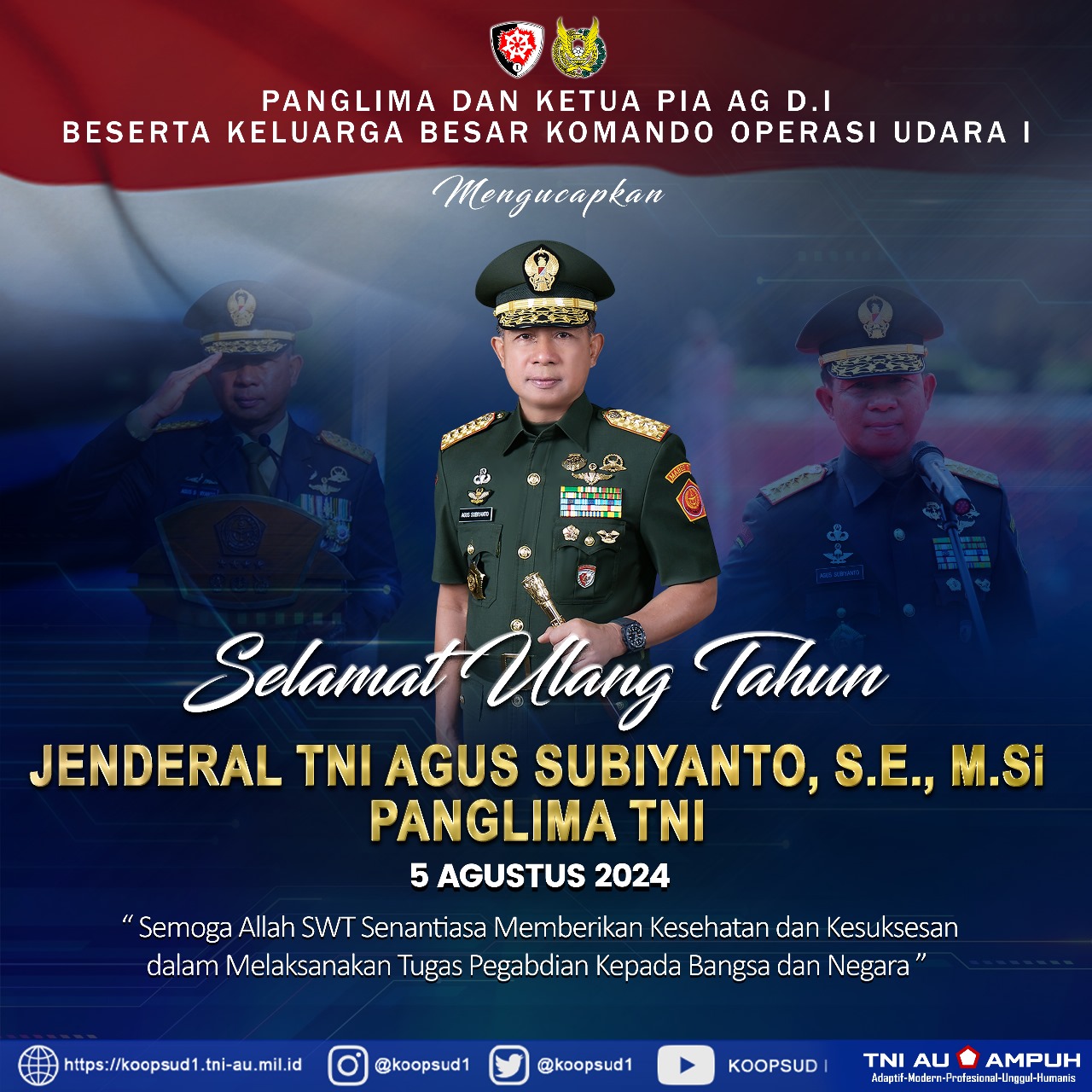 Berita Panglima Komando Operasi Udara I & Ketua PIA Ardhya Garini Daerah I Koopsud I beserta Keluarga Besar Komando Operasi Udara I Mengucapkan by koopsud berita August 5, 2024 August 5, 2024 0 comment Selamat Ulang Tahun Jenderal TNI Agus Subiyanto, S.E., M.Si Panglima TNI 5 Agustus 2024 #abhibhutiantarikshe #Koopsud1 Share 0 Rekomendasi untuk Anda Danlanud Suryadarma – Subang & Danlanud Maimun Saleh – Sabang... February 11, 2022 Pangkoopsud I Tinjau Pelaksanaan Serbuan Vaksinasi di Tangerang, Banten. February 26, 2022 Koopsud I Laksanakan Peringatan Isra Mi’raj 1443 H. March 16, 2022 Pangkoopsud I Silaturahmi ke Kosek IKN March 17, 2022 Koopsud I Gelar Latihan Survival Tempur “Madhi Yudha” di Subang,... March 21, 2022 Latihan Survival Tempur “Madhi Yudha” 2022 Resmi di Tutup March 23, 2022 Pangkoopsud I Meninjau Kesiapan Lanud RSA dan Satrad 212 sebagai... March 25, 2022 Koopsud I Laksanakan Penyusunan/Input Data RKA-KL TA. 2023 March 31, 2022 Pangkoopsud I: Kenaikan Pangkat Wujud Penghargaan Pimpinan Pada Para Personel... April 1, 2022 Pangkoopsud I: Bakti Sosial Wujud Sinergitas Pemda, Masyarakat dan TNI... April 5, 2022