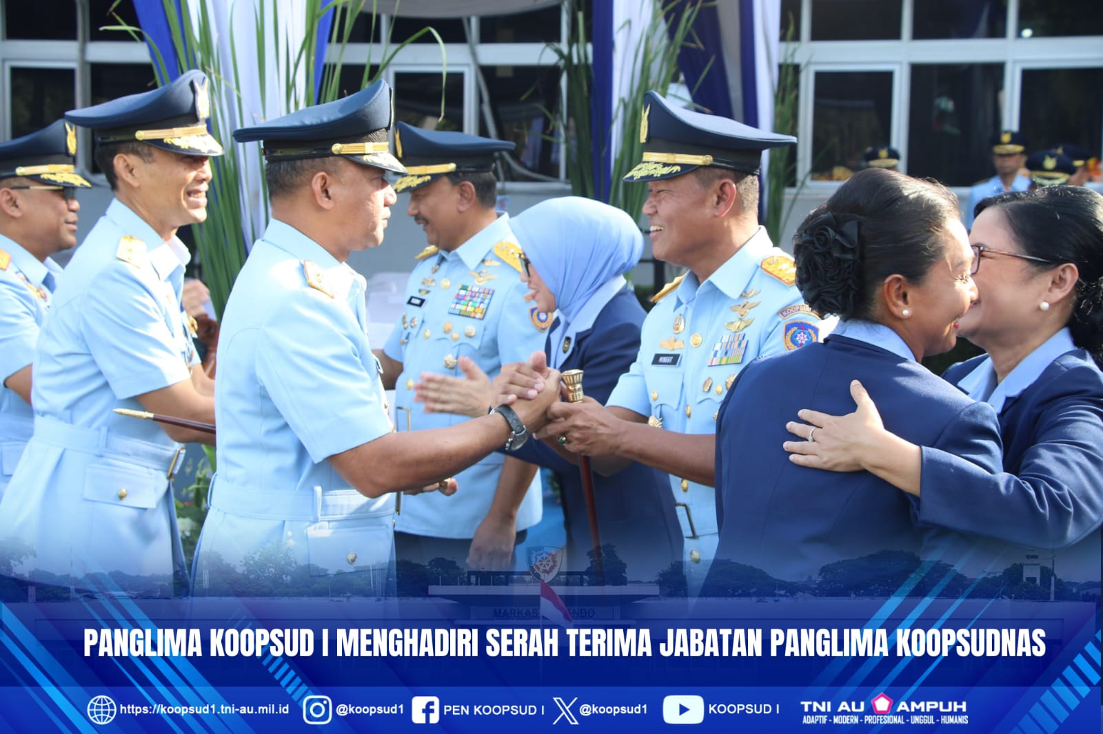 Jakarta-Penkoopsud I. Panglima Komando Operasi Udara I (Pangkoopsud I) Marsda TNI Muzafar, S.Sos., M.M., menghadiri kegiatan Serah Terima Jabatan Panglima Komando Operasi Udara Nasional (Pangkoopsudnas), dari Marsekal Madya TNI Ir. Tedi Rizalihadi S., M.M., kepada Marsekal Muda TNI Minggit Tribowo S.I.P., kegiatan dilaksanakan di Lapangan Apel Makoopsudnas Halim Perdana Kusuma Jakarta Timur, Jumat (20/6/25).