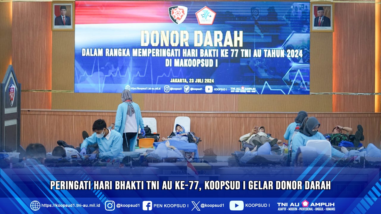 Jakarta, Penkoopsud I. Sebagai rangkaian kegiatan dalam memperingati Hari Bhakti TNI AU ke-77, Koopsud I menggelar Donor Darah bekerjasama dengan PMI Kabupaten Banten, bertempat di Gedung Roesmin Nurjadin Makoopsud I. (Selasa, 23-07-2024).