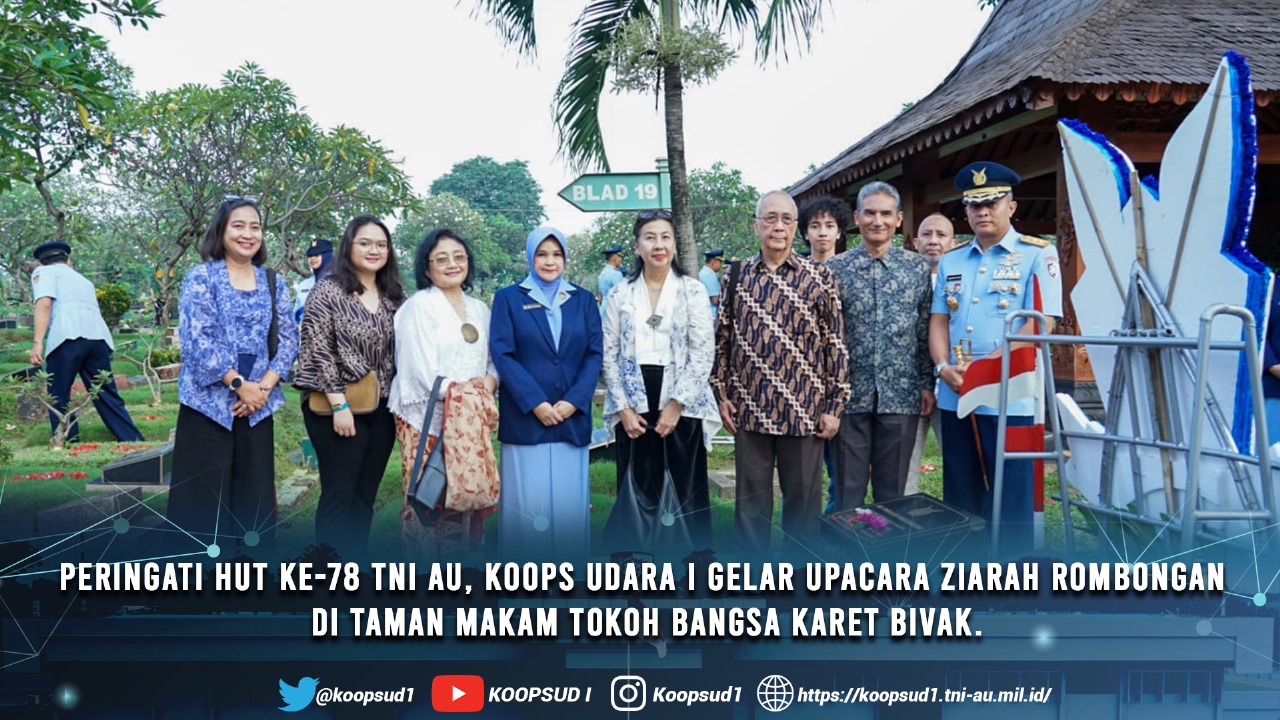 Jakarta, Penkoopsud I. Dalam rangka memperingati HUT ke-78 TNI Angkatan Udara 9 April 1946 – 9 April 2024, Komando Operasi Udara I sebagai penyelenggara menggelar Upacara Ziarah Rombongan di Taman Makam Tokoh Bangsa, Karet Bivak, Kec. Tanah Abang, Jakarta Pusat, yang dipimpin oleh Komandan Komando Pembinaan Doktrin, Pendidikan, dan Latihan TNI AU (Dankodiklatau), Marsdya TNI Dr. Arif Mustofa, M.M. (Rabu, 17-4-2024).