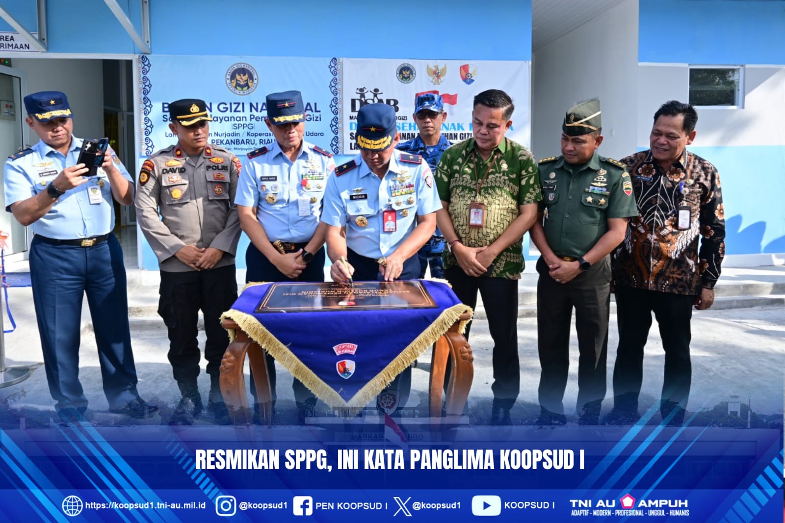 Jakarta. Penkoopsud I. Dengan diresmikan Satuan Pelayanan Pemenuhan Gizi (SPPG) di Lanud Roesmin Nurjadin diharapkan menjadi awal dalam mencetak generasi yang sehat, cerdas dan berakhlak mulia menuju Indonesia Emas 2024 khususnya di wilayah Pekanbaru dan sekitarnya.