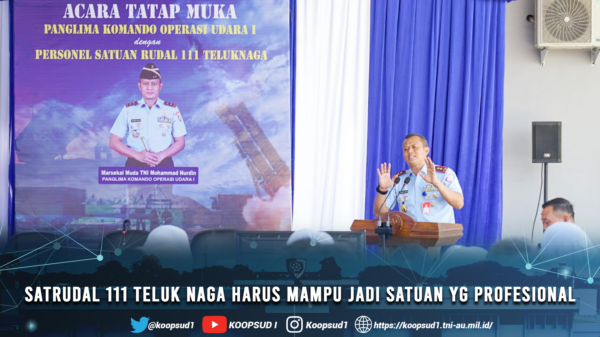 Dalam kunjungannya ke Satrudal 111 Teluk Naga, Pangkoops Udara I didampingi oleh Ketua PIA Ardhya Garini Daerah I Koopsud I Ny. Erin M. Nurdin beserta Dankosek IKN Marsma TNI Abdul Haris, M.M.Pol., MMOAS., serta Aspers, Aslog, Aspotdirga, Askomlek dan Pabandyadukops Sops Kaskoopsud I, yang disambut langsung oleh Dansatrudal 111 Teluk Naga Letkol Lek M. Suarna Hasal, M.Han., beserta jajar kehormatan dari personel Satrudal 111 Teluk Naga.
