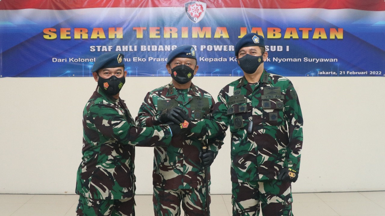 Jakarta, Penkoopsud. Panglima Komando Operasi Udara I, Marsekal Muda TNI Ir. Tedi Rizalihadi S., M.M. memimpin langsung acara serah terima jabatan (Sertijab) Staf Ahli (Sahli) bidang Air Power dari Kolonel Tek Sunu Eko Prasetyo, S.T. yang diserahkan kepada Kolonel Tek Nyoman Suryaman di Lobby Makoopsud I. (Senin, 21-02-2022).