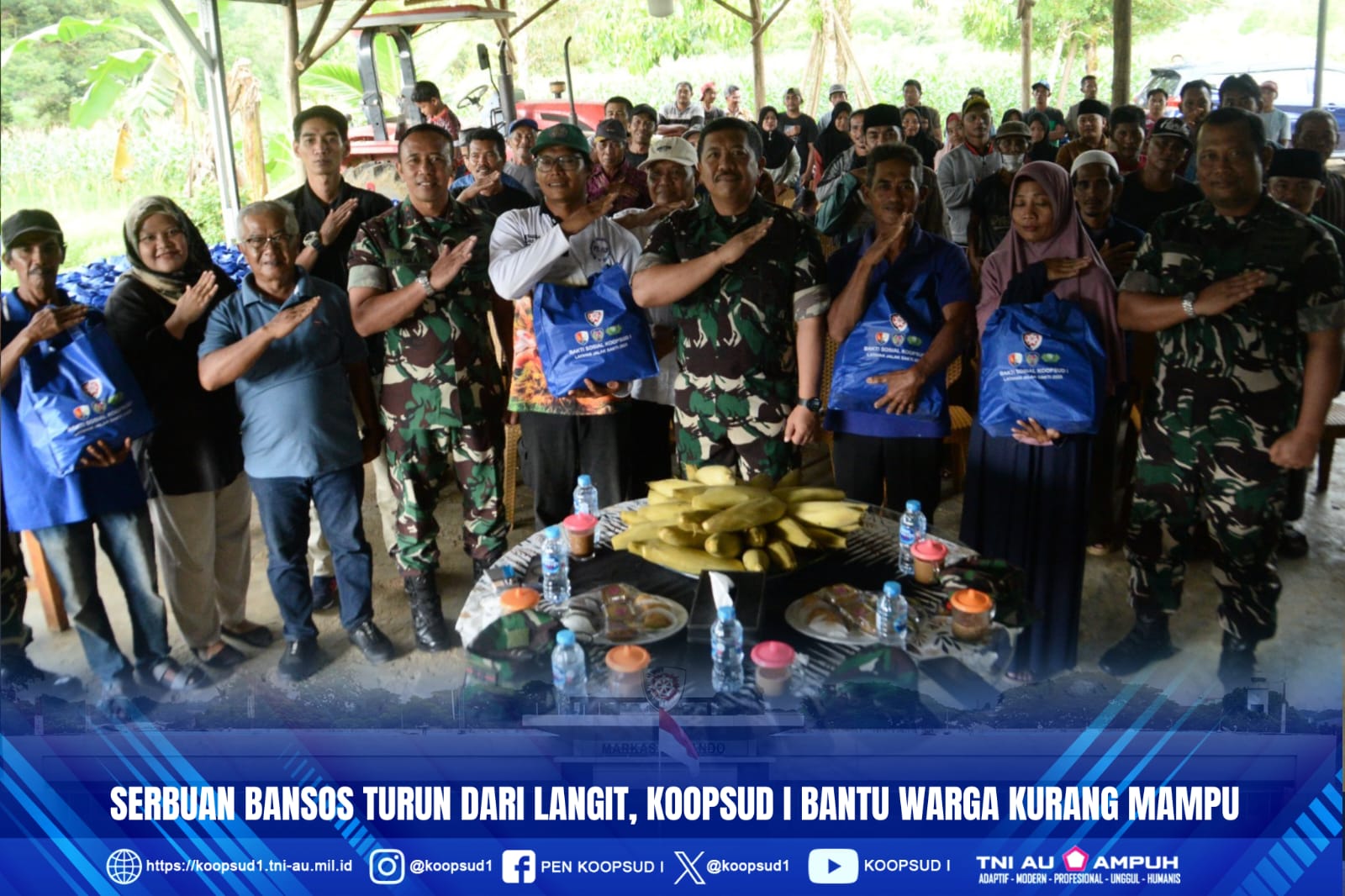 Belitung. Penkoopsud I. Sebagai insan TNI Angkatan Udara, Koops Udara I beserta jajarannya kembali melakukan serbuan dari langit dengan membagikan sembako kepada Kelompok Tani Sinar Jaya dalam rangka Gladi Lapangan Latihan Jalak Sakti dan Hardha Maruta I 2025, dibawah pimpinan Asops Kaskoops Udara I Kolonel Pnb R. Endri Kargono, M.Han., Kali ini bertempat di Dusun Kelakap Usang, Desa Perwas, Kec.Tanjung Pandan, Belitung, Jumat (20/6/25).